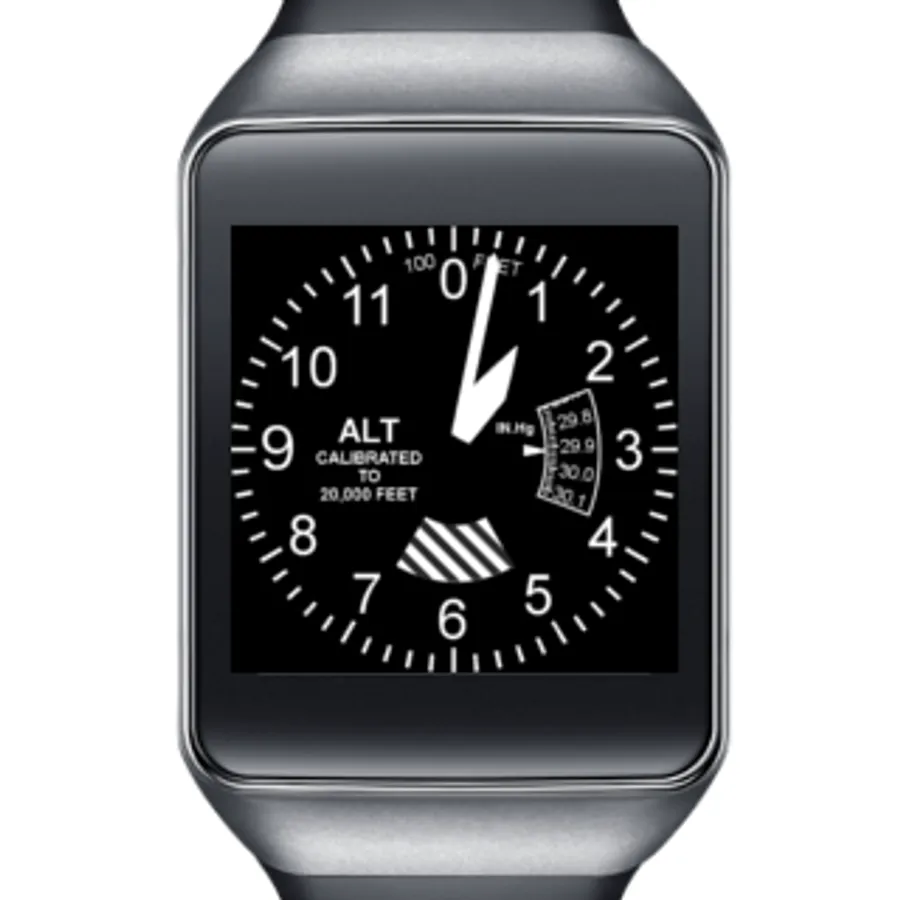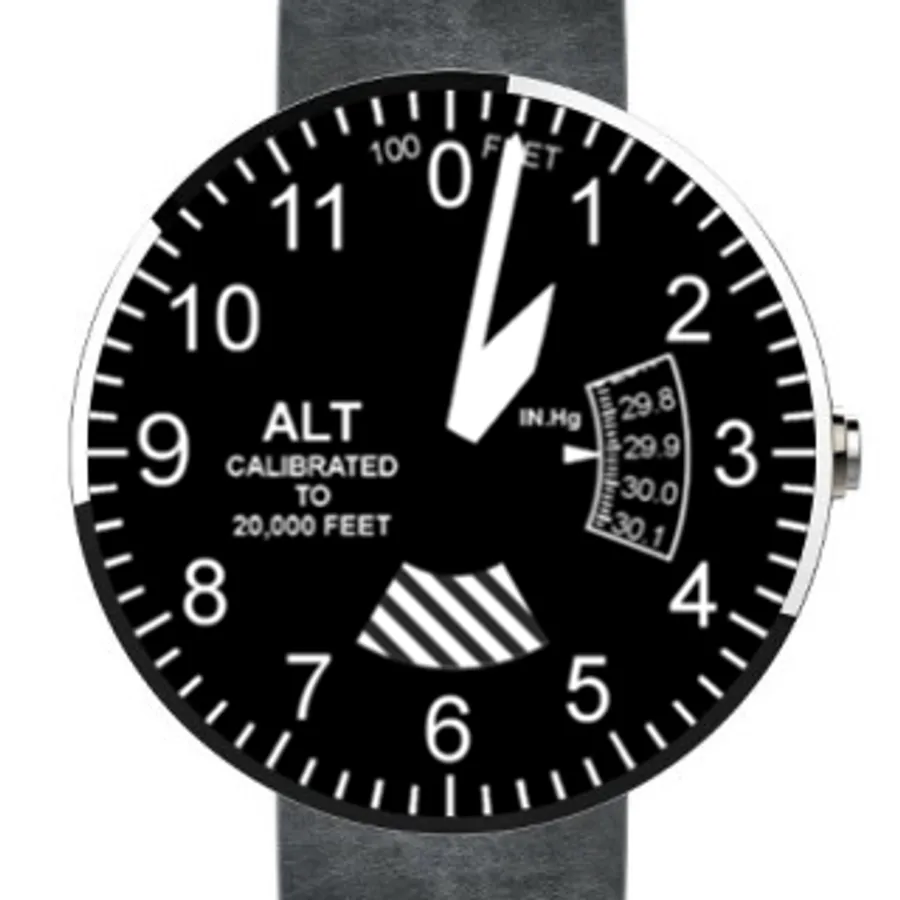 Now you can get your aviation fix while checking the time! Made for aviators, this altimeter watch face features a working "barber pole" indicator like the one that normally indicates low vs high altitude. The indicator will show striped in the morning hours, and blank in the afternoon.