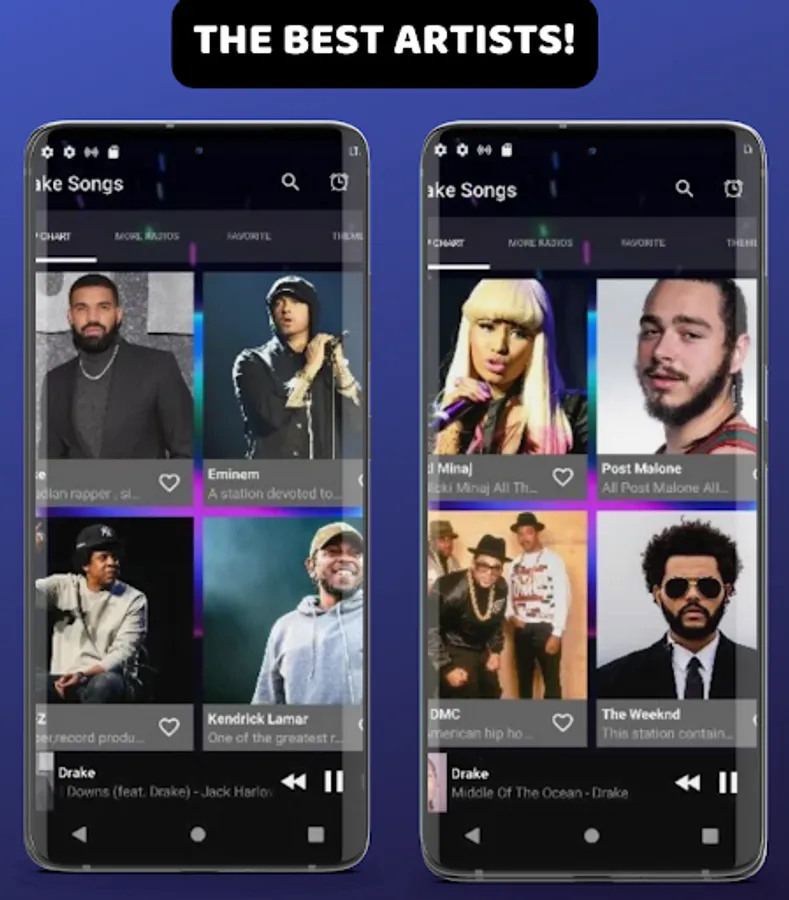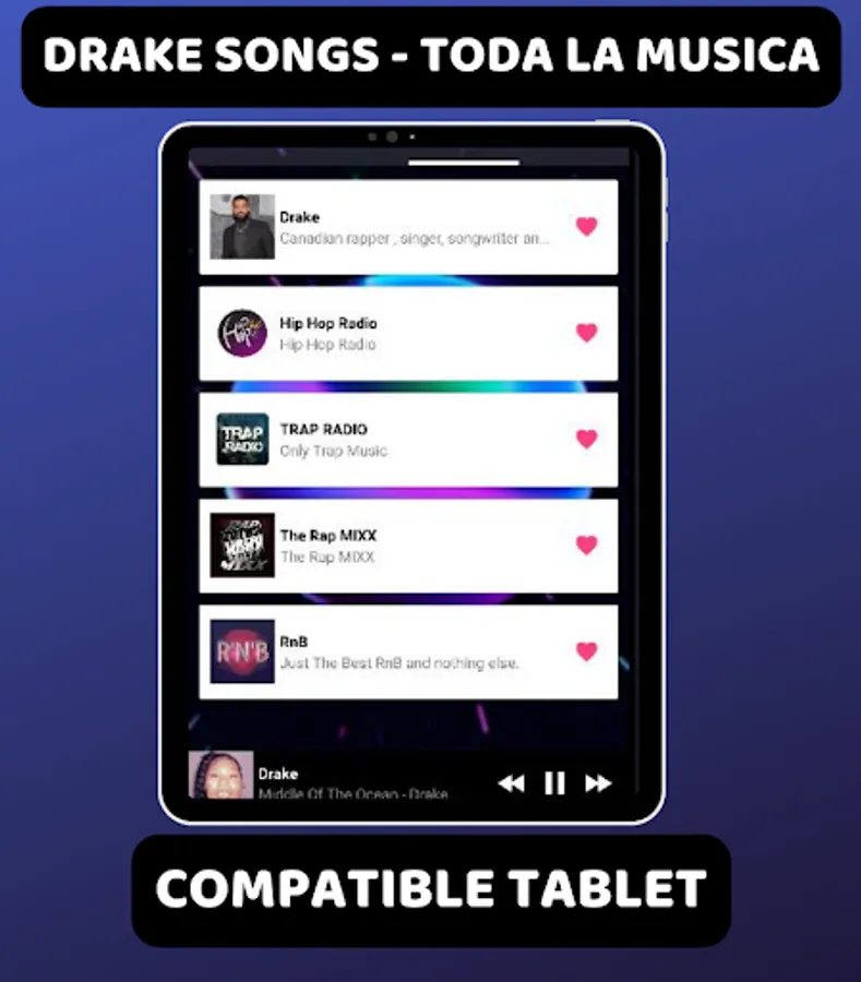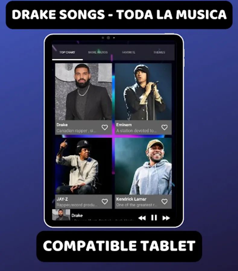 No lo dudes más y escucha a tu artista favorito en nuestra app Drake Songs – Toda la Música, escucha totalmente gratis desde tu teléfono celular o tableta, 24/7.