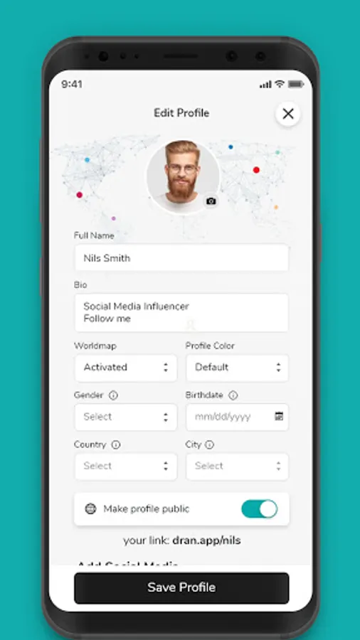 The Dran app enables you to easily access your Dran profile and choose what you share with your Dran Dot. You can customize your Dran profile however you would like by simply using Drag and Drop.