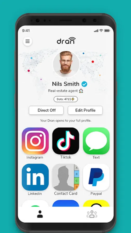 Dran is the fastest way to share your social media, contact info, and more! By tapping your Dran Dot on someone else’s phone you can instantly share your entire Dran profile with anyone you meet. The coolest part: They don't need an app or a Dran Dot to receive your info.