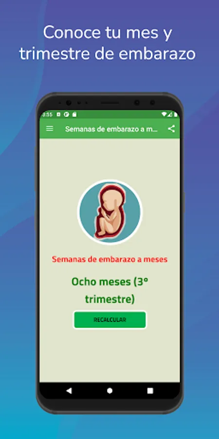It's very easy: enter the weeks and days (optional) you've been pregnant and click on Calculate. You will immediately know how many months pregnant you are and what trimester you are in. In addition, you will see a referential image of how your baby looks according to your trimester.