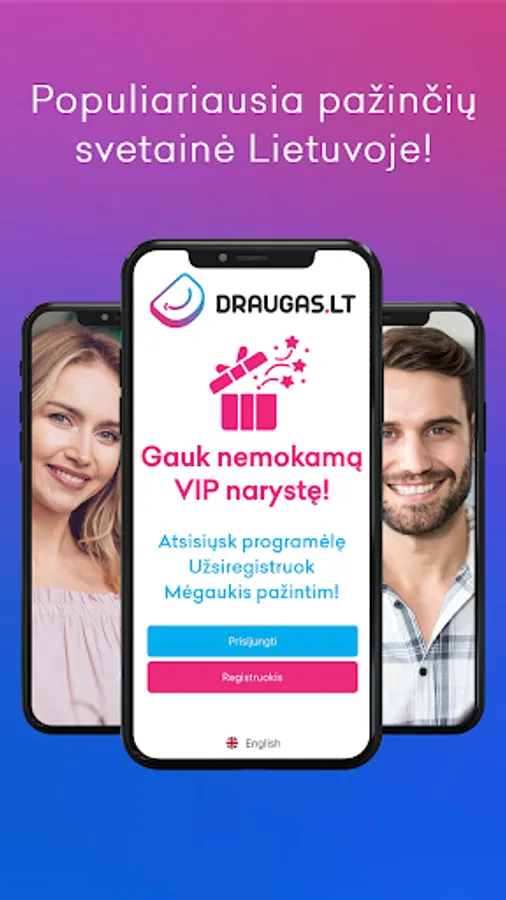 Join the largest dating club in Lithuania and receive VIP membership gifts, 50 credits and 3 virtual gifts.