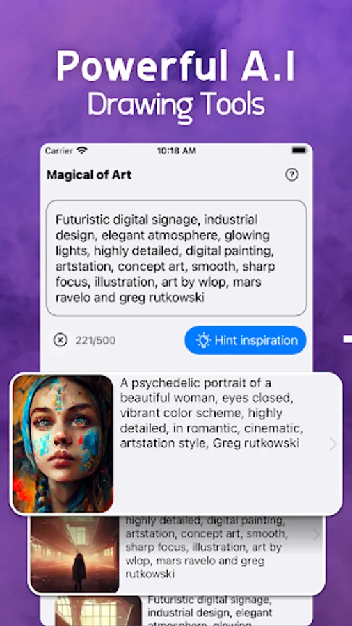 Turn words into works of art maker drawn by artificial intelligence art technology! All you need to do is type ideas in words and watch this app turn your ideas into reality in seconds.