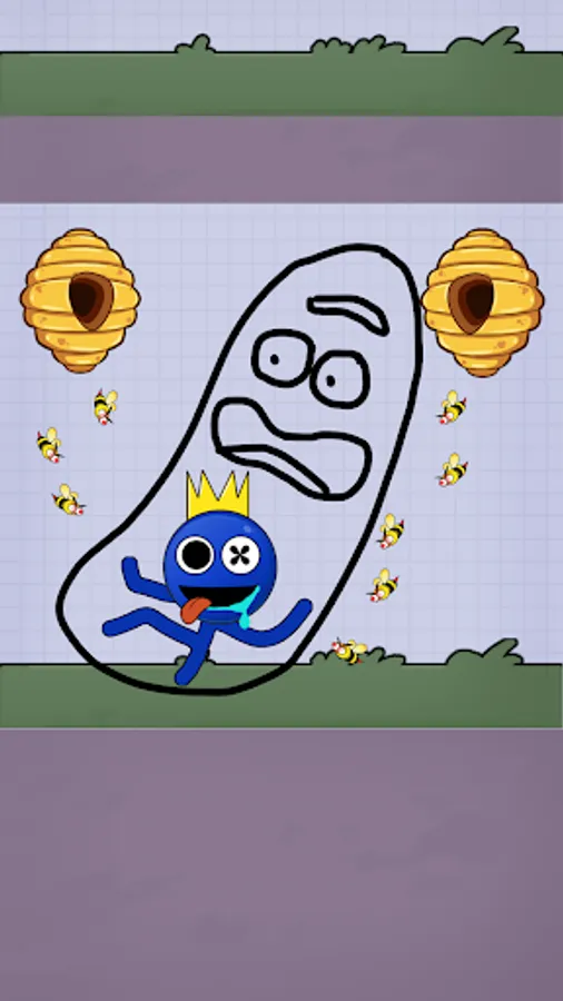1. Draw a line to save your rainbow monster from the bees to win the game. You can draw any shape as long as you can Save the Rainbow Blue Monster.