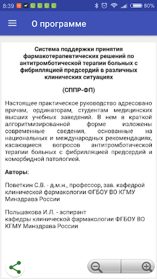 The program is addressed to physicians, residents, medical students of higher educational institutions. It in a brief algorithmic form describes the modern information based on national and international recommendations concerning issues of antithrombotic therapy in patients with atrial fibrillation and comorbid disorders.