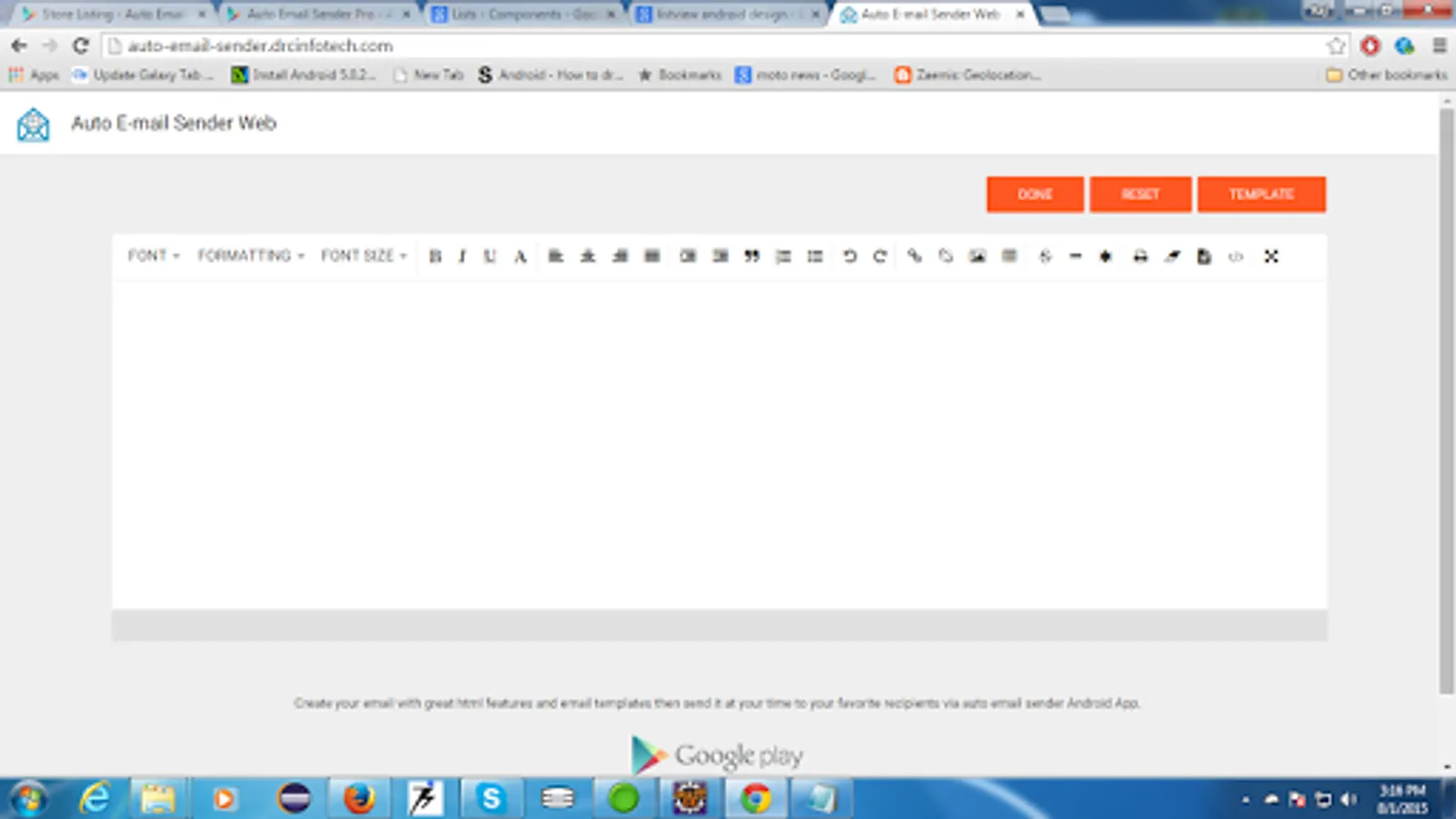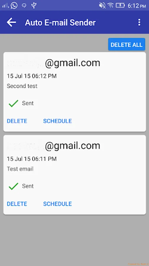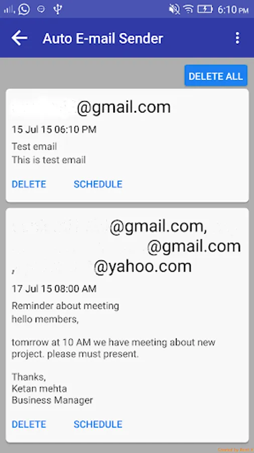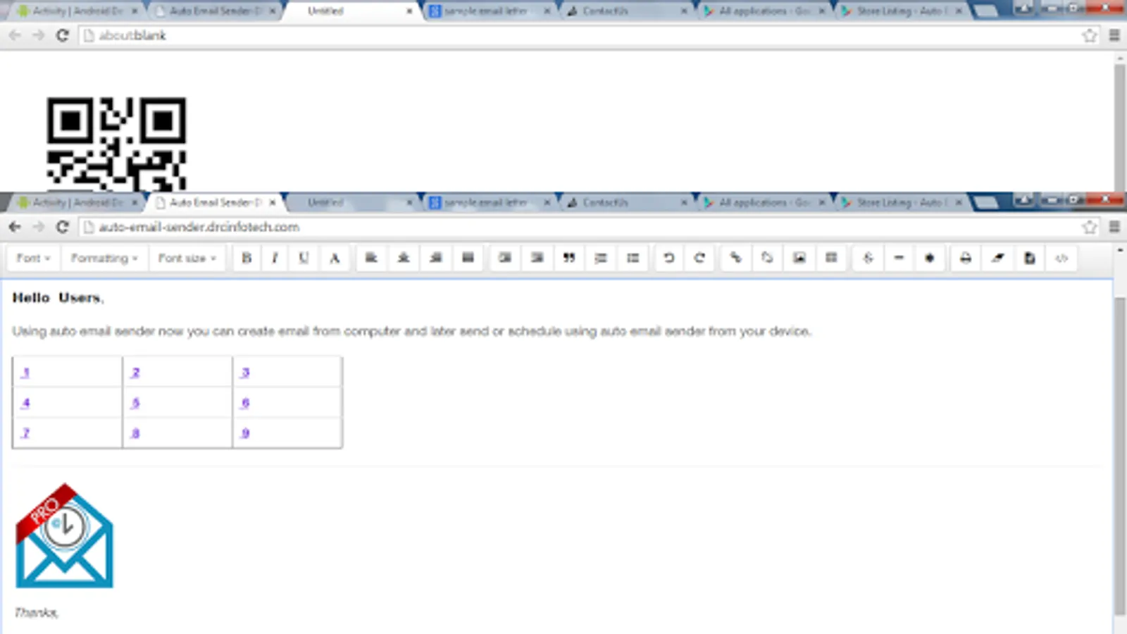 Auto Email Sender Pro app is an enormously powerful app with very user friendly interface, designed by DRC INFOTECH. It enables you to send Email automatically to the preferred recipients at a scheduled time via your internet provider (Wi-Fi-mobile).