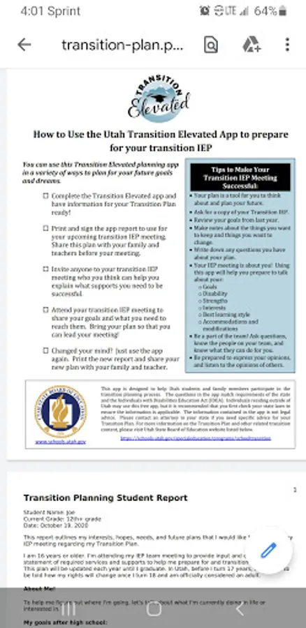 This app is intended to serve as a tool for Utah students, family members, and educators during the transition planning process. It is based on the requirements of the Individuals with Disabilities Education Act (IDEA) - https://sites.ed.gov/idea/. As a Utah student with a disability who may be turning 16 years or older, or a family member of a transition age student, this app can help prepare for IEP meetings where transition planning will be discussed and the transition plan will be developed, and/or modified. Individuals residing outside of Utah may use this free app, but the information needed for transition plans in other states may be different. The information in this app is for general information purposes only, it is not legal advice.