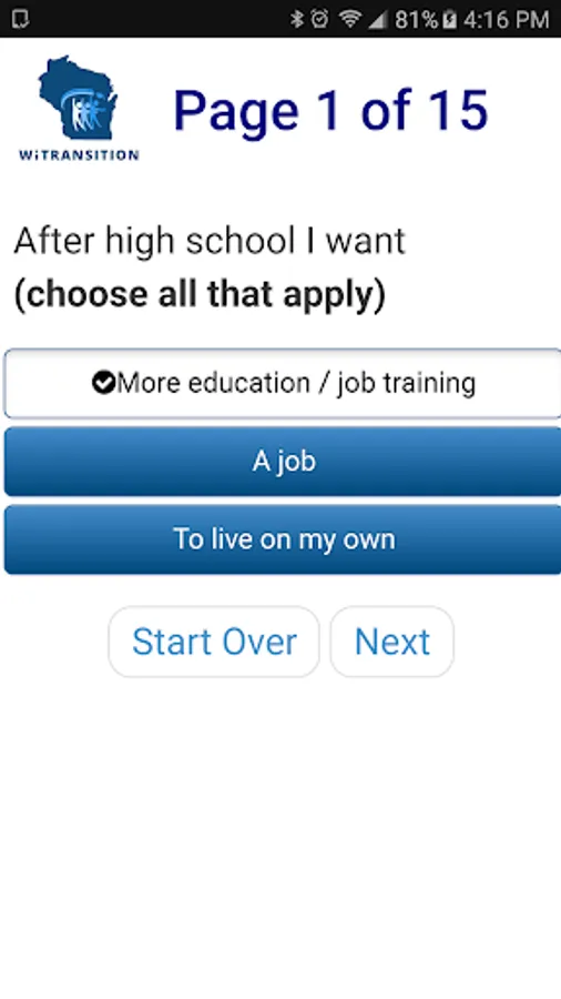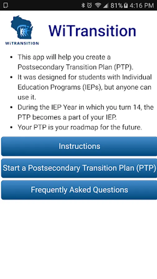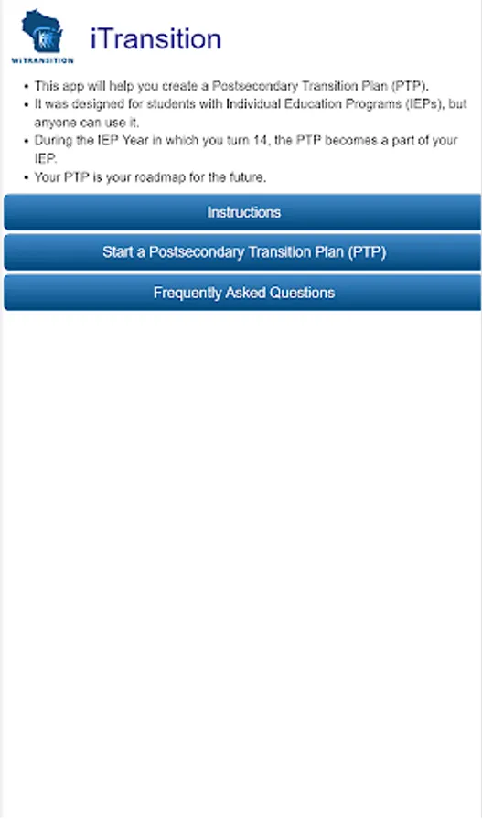 This app is intended to serve as a guide to Wisconsin students, family members, and educators during the transition planning process. It is based on the requirements of the Individuals with Disabilities Education Act IDEA - http://tinyurl.com/jcvoaz3. As a Wisconsin student with a disability who may be turning 14 years or older, or a family member of a transition age student, this app can help prepare for the Individualized Education Program (IEP) meeting where transition planning will be discussed and the Postsecondary Transition Plan (PTP) will be created. Individuals residing outside of Wisconsin may use this free app, but the information needed for transition plans in other states may be different.