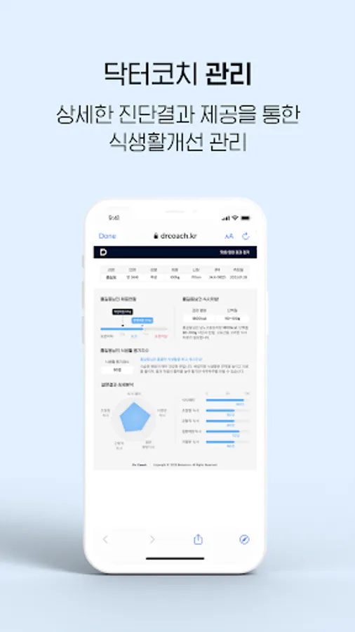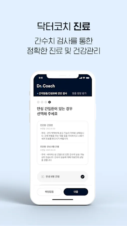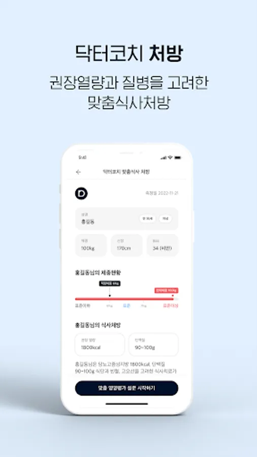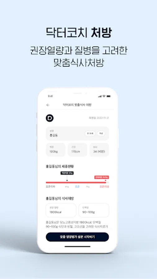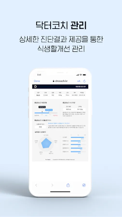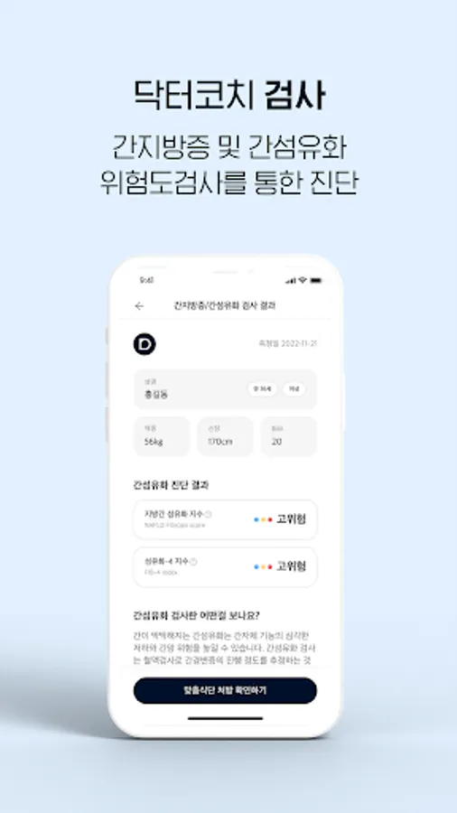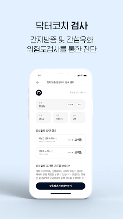 The Dr.Coach screening app, created by obesity specialist medical staff, clinical nutritionists, and experts in the digital field, provides customized nutritional prescriptions in consideration of my lifestyle and health condition, along with the risk assessment of non-alcoholic fatty liver disease.