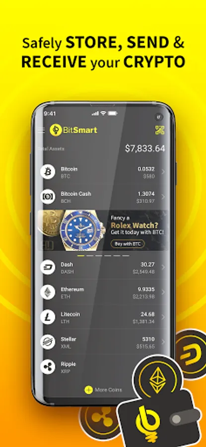 With BitSmart blockchain wallet, you can expect so much more than just an ordinary crypto wallet. This crypto wallet app allows users to send, receive, and store cryptocurrencies such as: Bitcoin (BTC), Ethereum (ETH), Ripple (XRP), Litecoin (LTC), Stellar (XML), Dash, Bitcoin Cash (BCH) and any ERC-20 token.