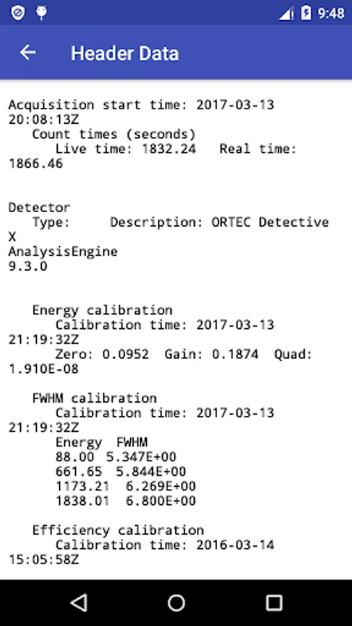 Calibration Data and a number of other items (metadata) that are included in the spectral data file are displayed on a "Header Data" screen.