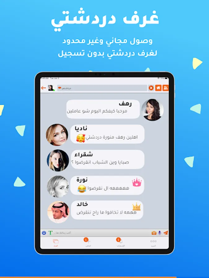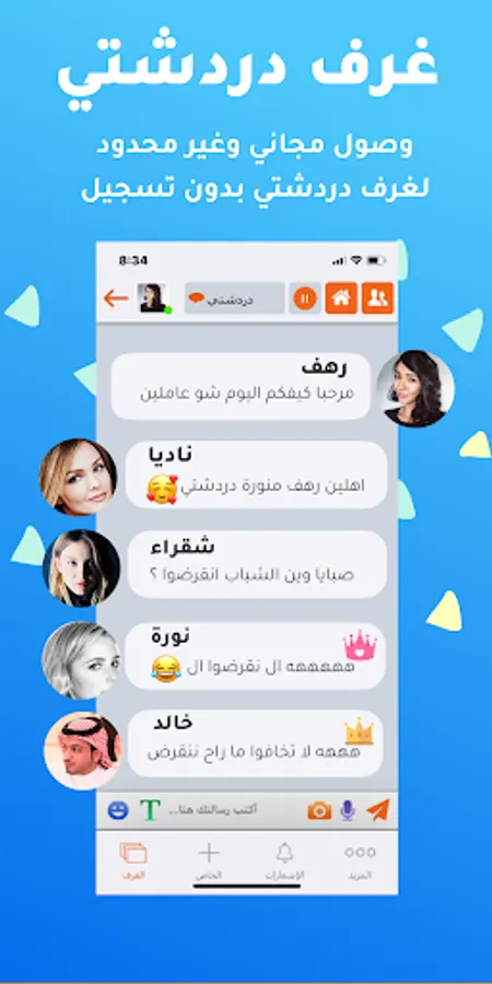My chat is an entertainment chat platform that offers you free chat rooms for dating, it provides Arabic chat rooms and chatting radio service that broadcasts the best Arab music and programs 24 hours, you do not need to register your data to enter my chat Register your nickname and start getting to know new friends on my chat