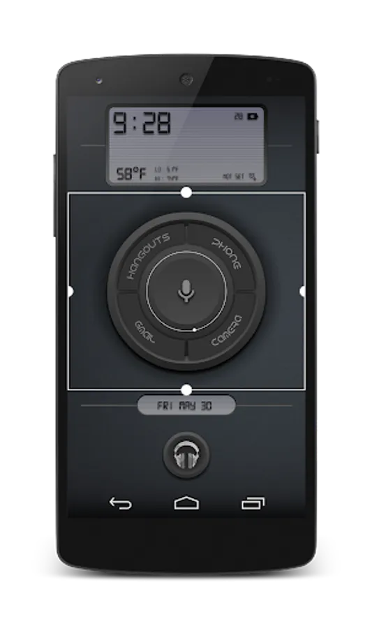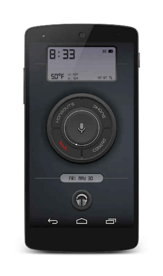 The main center widget has your short cuts for Hangouts, Gmail, Phone, Camera, and Google Voice Search. Text for Hangouts, Gmail, and Phone change color for notifications. The white center ring rotates for each minute. Center mic icon activate Google Voice Search.