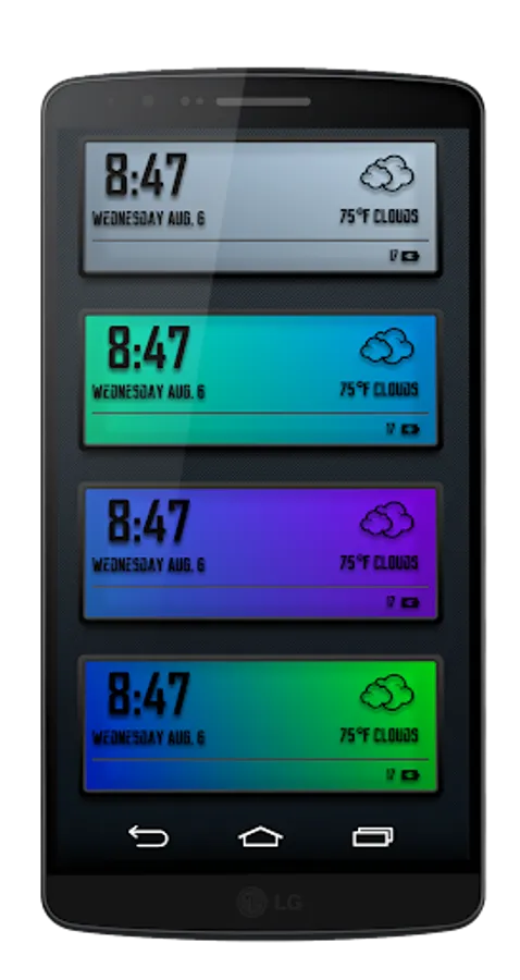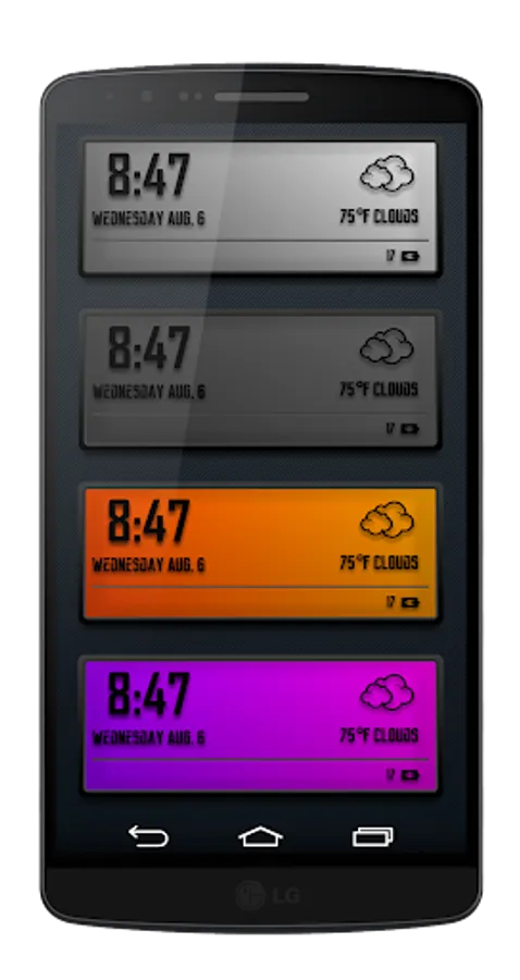 This widget pack is an assortment of simple yet detailed clock widgets that should fit any home screen. All widgets display time, day/month/date, weather temp and conditions, and battery percent.
