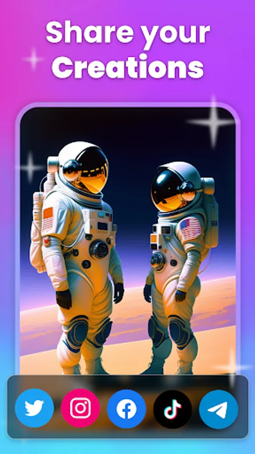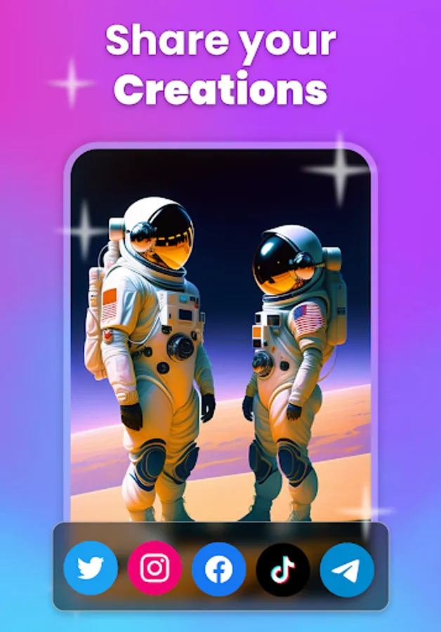 Go viral by posting your masterpieces on social media or sharing them with your friends! With this AI art creator, your creative creation can be used as an avatar profile icon, NFT, or new wallpaper.