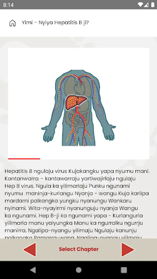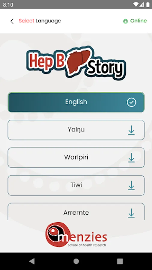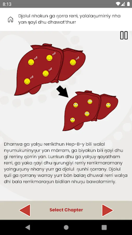 The Hep B story is a visual, interactive app in both English and Yolŋu matha designed for patients living with chronic hepatitis B and their families. It tells the story of the Hep B virus, how you get it, what happens over time, how you know you have it, as well as details about immunisation and treatment (including game). There is also a separate women’s section dealing with mother to child transmission and ways to prevent it. It was produced in conjunction with Yolŋu people who are Indigenous Australians living in northern Australia and is grounded in Yolŋu culture, worldview and language.