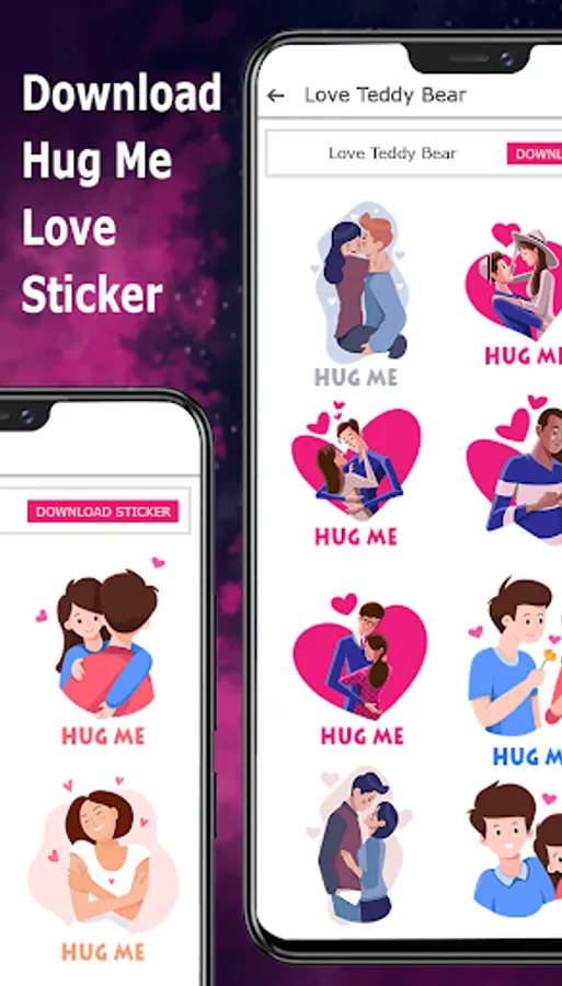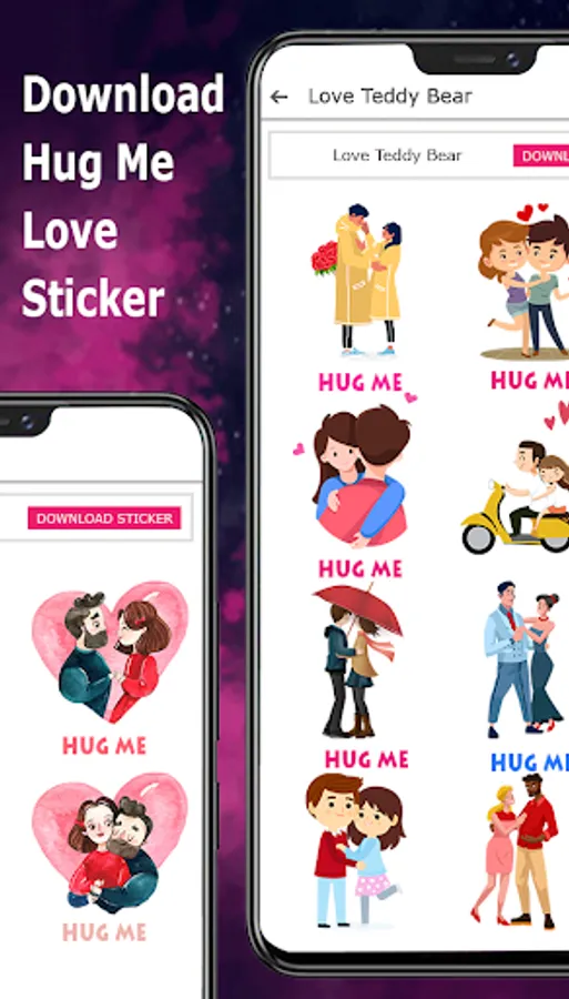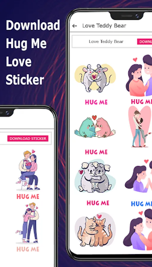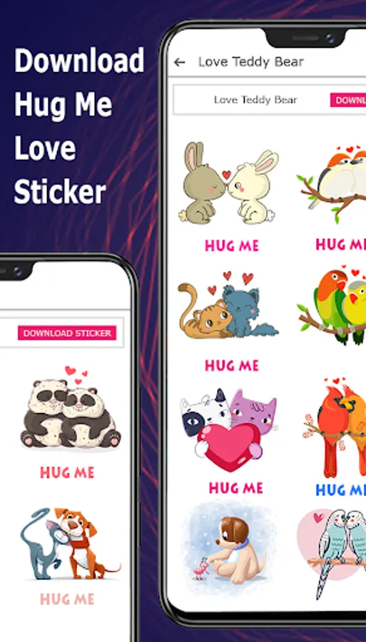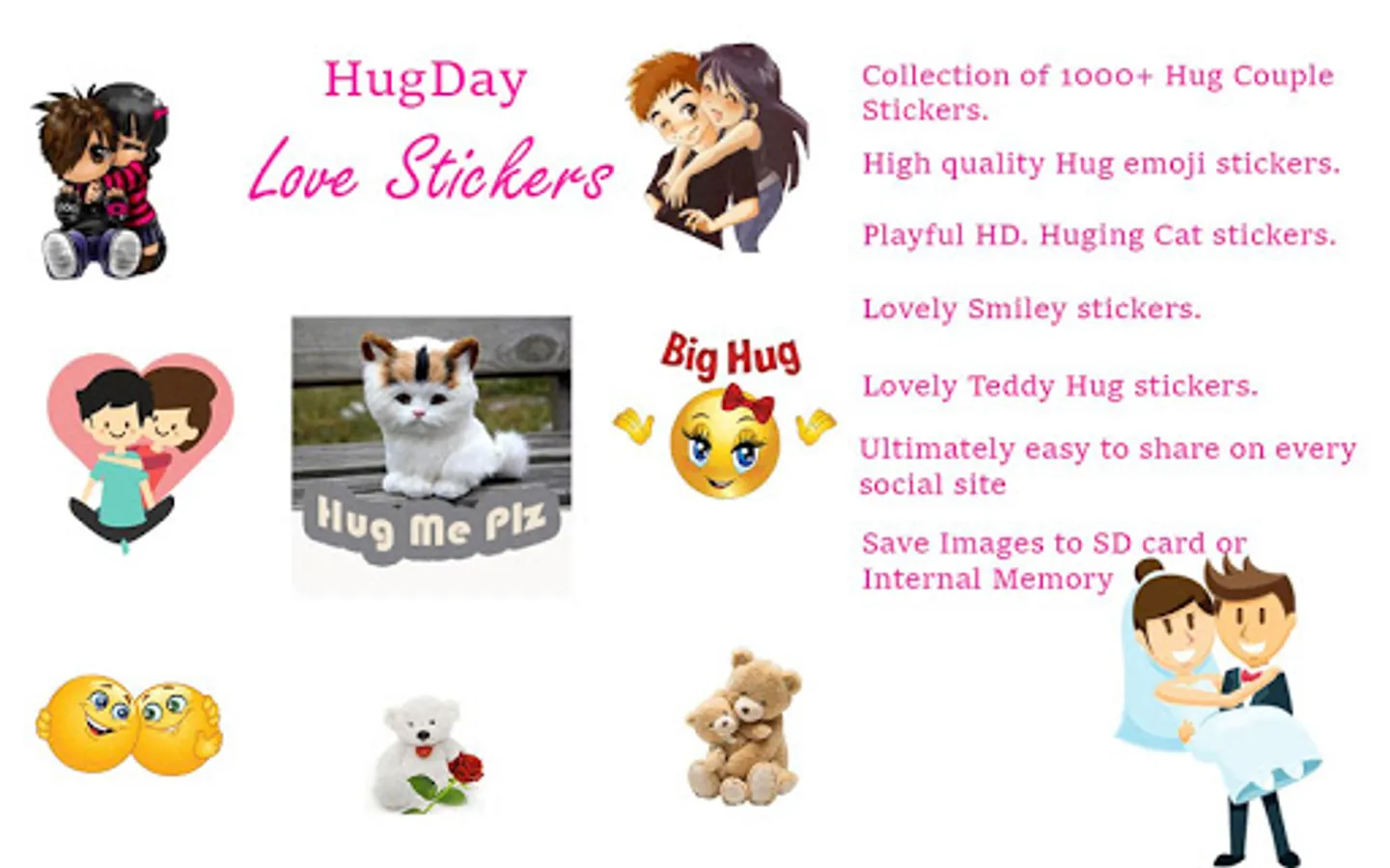 ♥ Various Categories, Cuople hug, Emoji hug, cute animal hug, Teddy hug, love bird, cat hug , love stickers, Love Emoji and text chat.