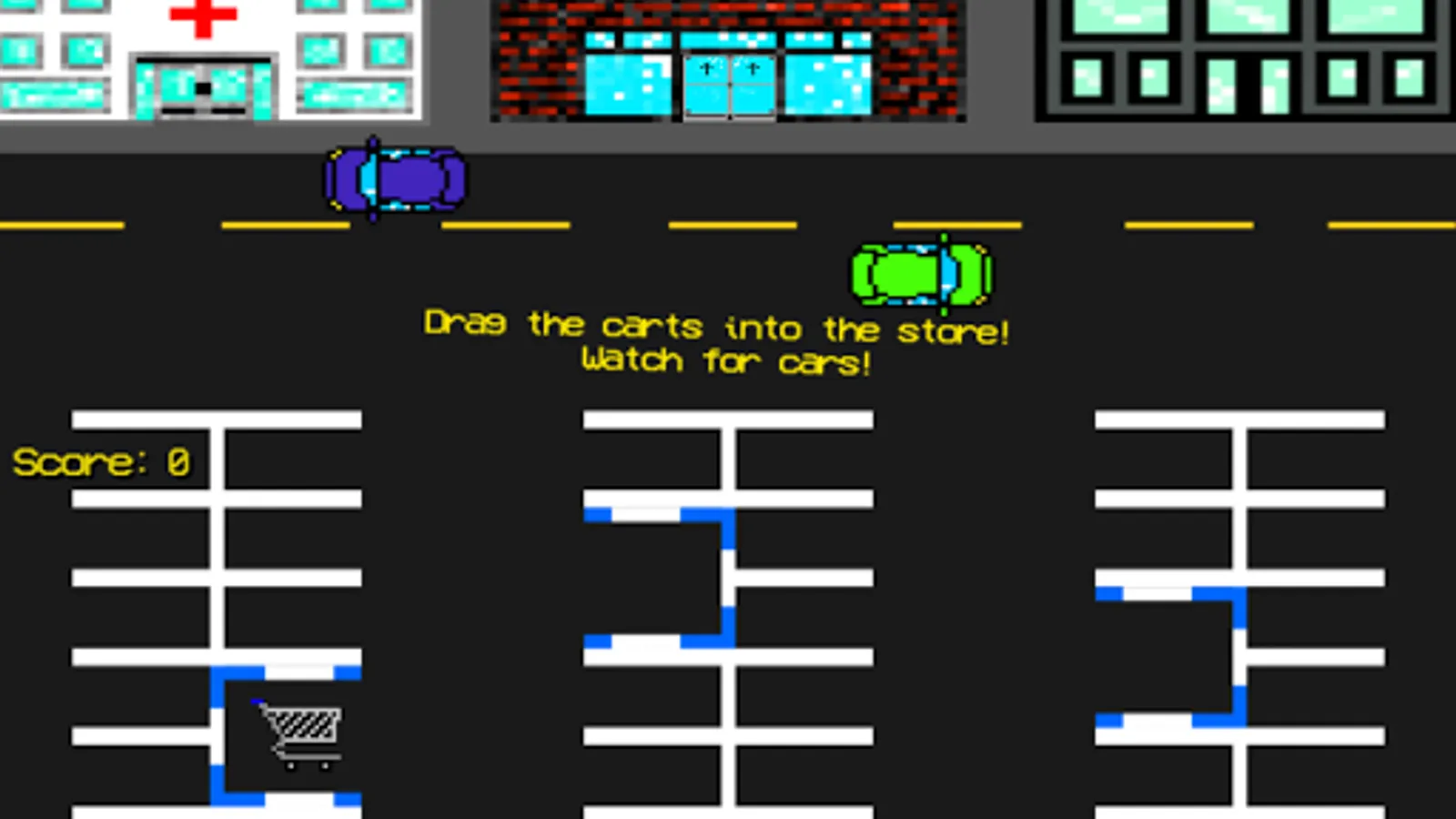 The goal is to collect as many carts as you can without being ran over by the speeding drivers in the parking lot!