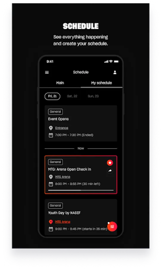 · See everything happening during the event, add notifications for your favourite activities, and create your own personalized schedule