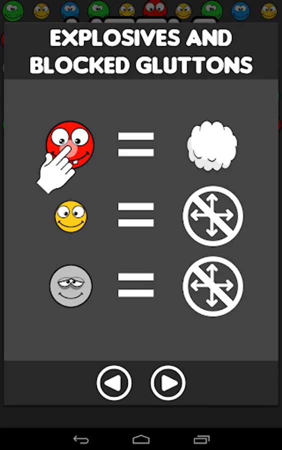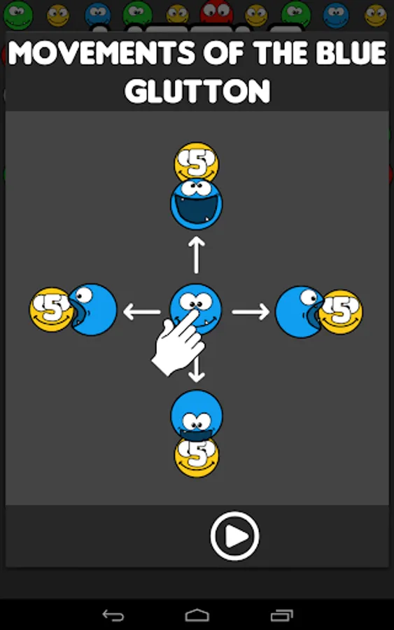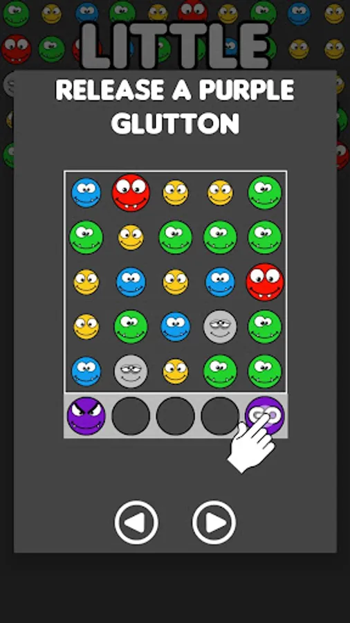 Swipe left, right, top or bottom to eat a glutton. Eat up to 4 gluttons at once on the same line or column to score more points. Touch a Red or Purple glutton to make him disappear.