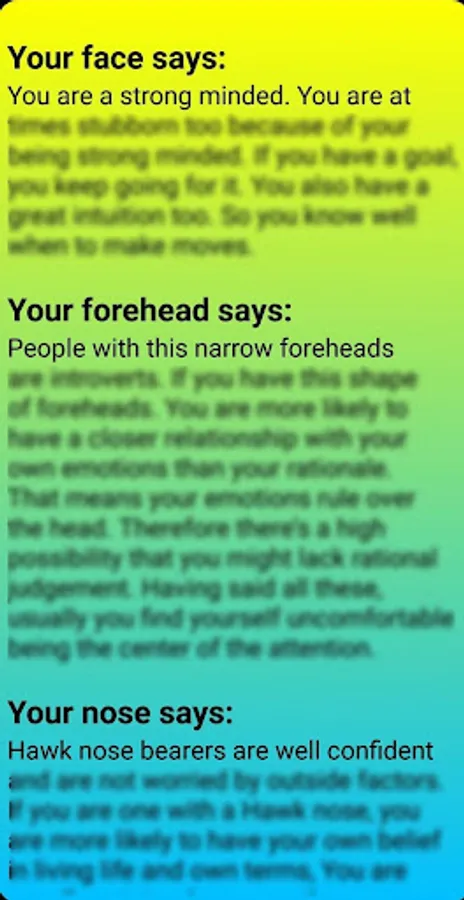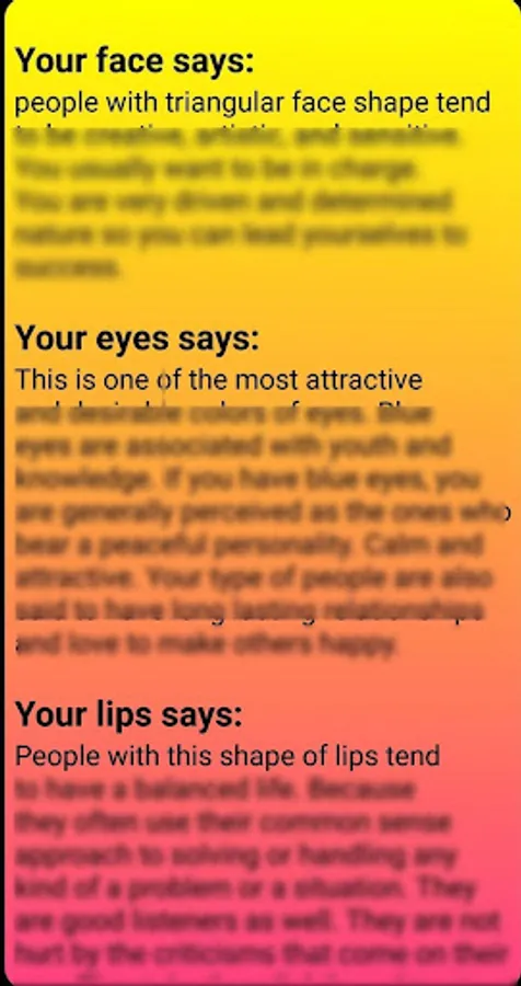 Face Reader App is designed to give people an overall idea of what their face says about them by reading their facial features. The face reader enables its users to select his/her face shape, forehead, nose, lips shape and the color of their eyes and get their personality type and traits. By downloading this app, you can find your personality type, traits, inner strengths and behavioral types according to physiognomy.