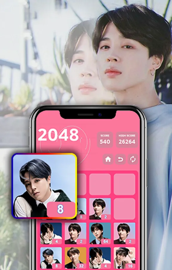 This puzzle game has a simple rule: there are 4x4 squares (16 cells). Each cell is a BTS member's picture (V, Jungkook, Jimin, Jin, Suga, RM, JHope) and corresponding a score. Just swipe rectangle cells to match them together. Sum the same numbers and your score will increase as fast as more you will merge. Can you reach the 2048th cell? It’s not an easy task! Enjoy and win!