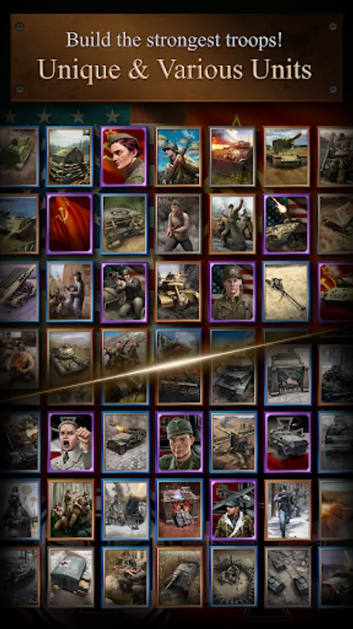 ● Collect different type of history-based units such as Infantry, Vehicles, Tanks, and Buildings. Build the strongest troop and gain the victory. Also, there are some heroes who motivated by real war heroes.