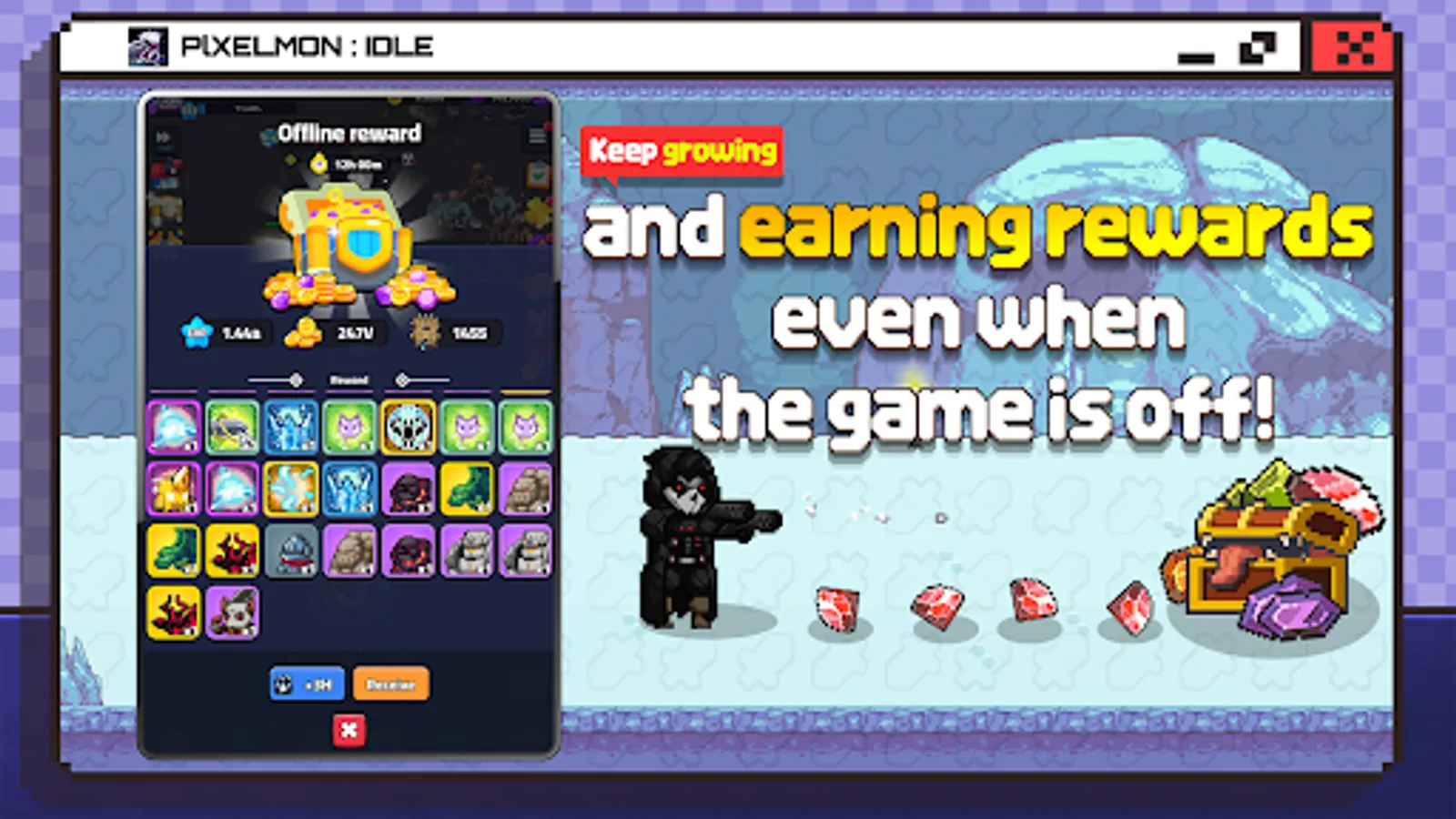 - Even when you're offline, the Idle RPG system ensures your Pixelmons keep growing and collecting rewards. Gather gold and items even in offline mode!