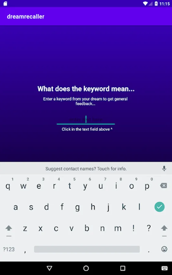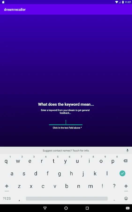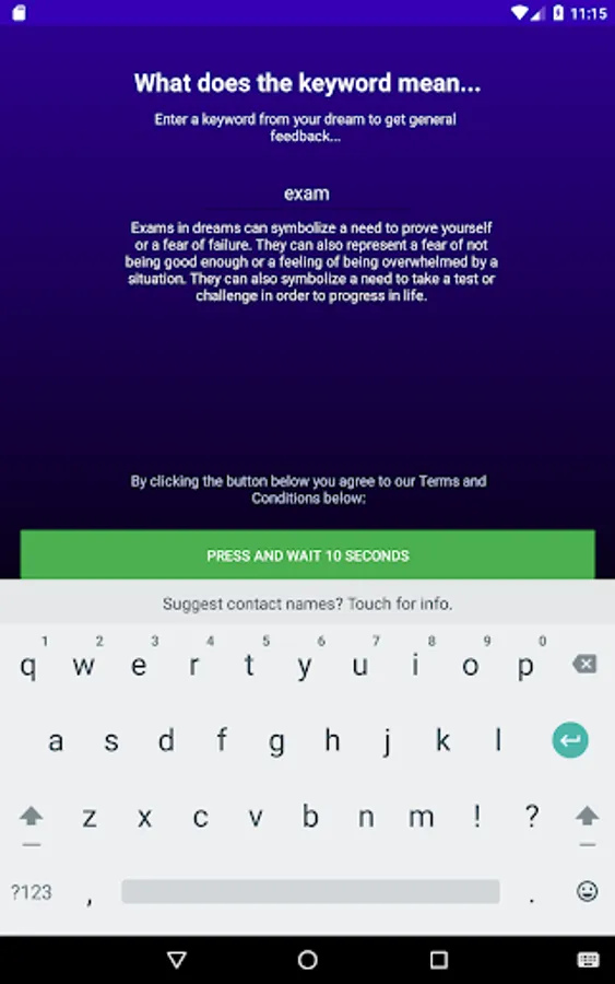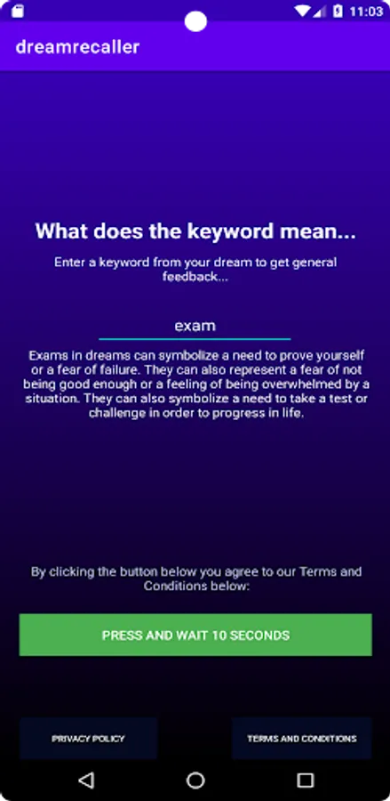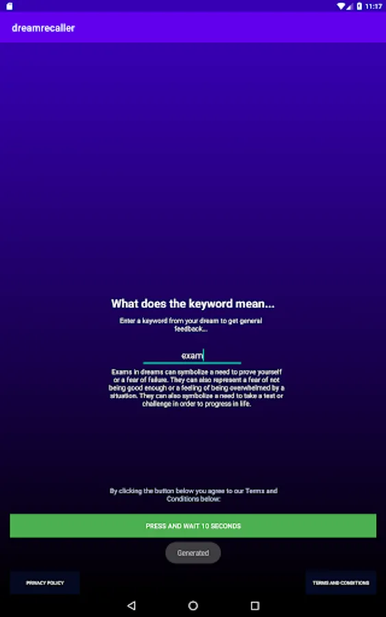 Type in a keyword from your dream to see what that represents generally. The app allows you to enter a keyword to help you begin to understand your dreams.