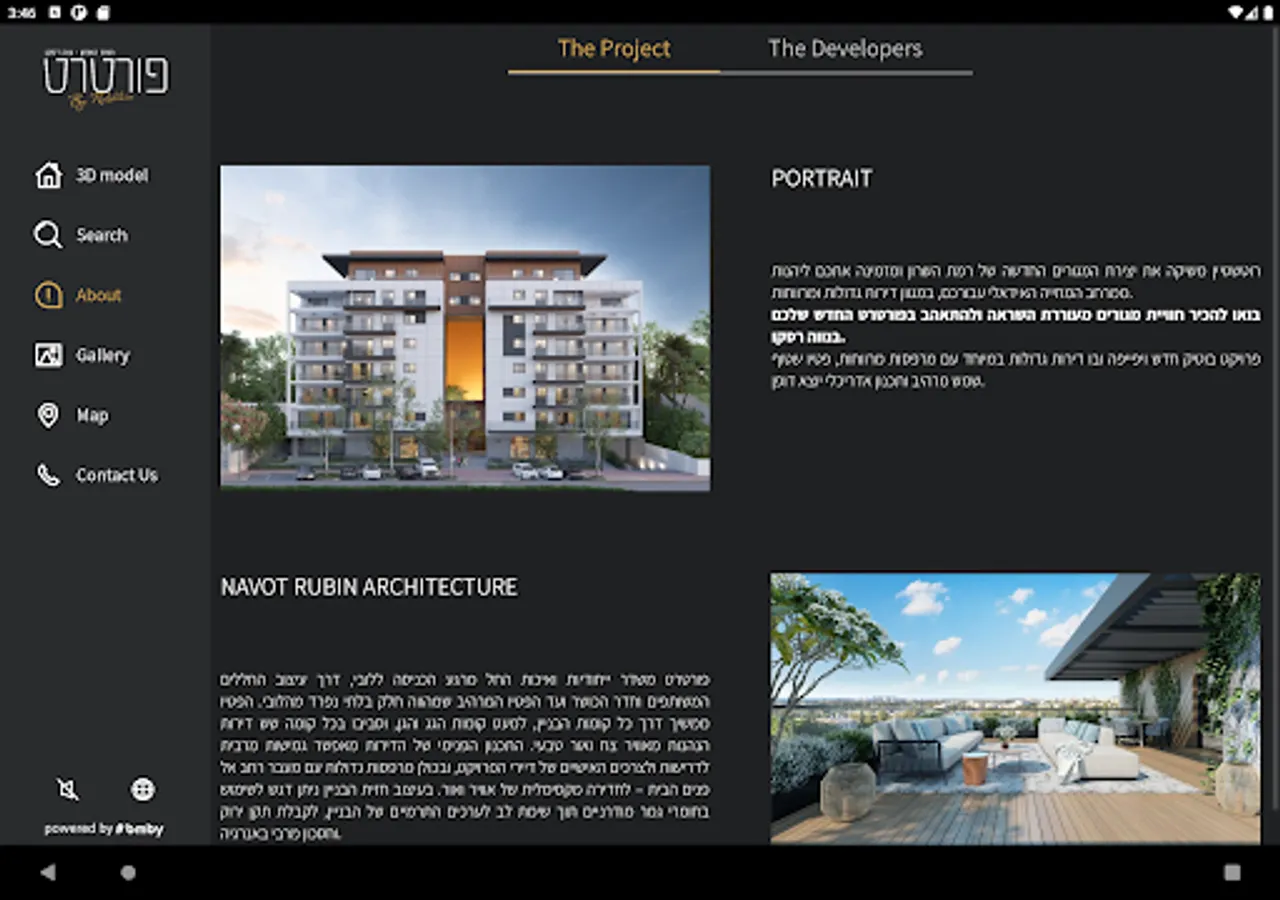 באפליקציה תוכל לקבל בלחיצת כפתור חווית תלת מימד של סביבת הפרויקט ושל הדירות המוצעות למכירה. האפליקציה מאפשרת לקבל נתונים לגבי הדירה המבוקשת לפי מסננים של גודל, מחיר, מיקום ועוד... ולעבור סיור תלת ממדי מרהיב בתוך הדירה ובסביבת הפרויקט החיצונית.