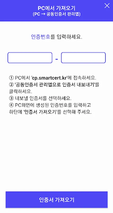 - Connect the joint certificate stored in the user's PC to http://cp.smartcert.kr and safely move and You can save it.
