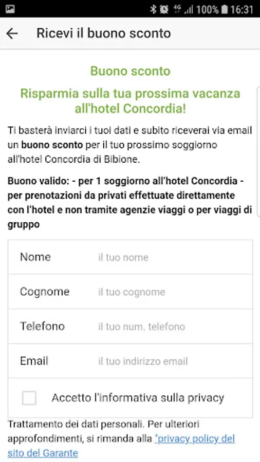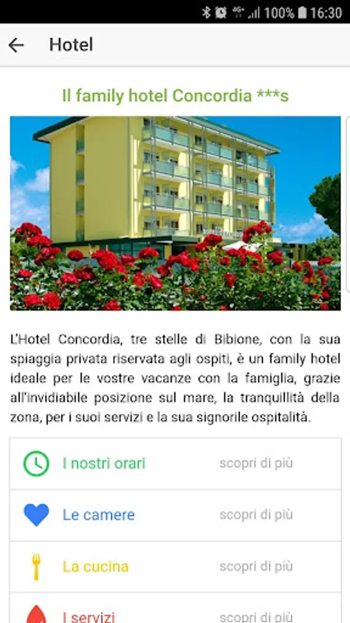 Inside the app Concordia hotel you will find all the information, contacts, schedules, services included and paid, the photos, to know even before you arrive, every detail of the structure. Directly from the app you book your holiday, you will receive the holiday voucher "Hotel Concordia". In addition, you will be constantly updated about news, offers and hotel packages.