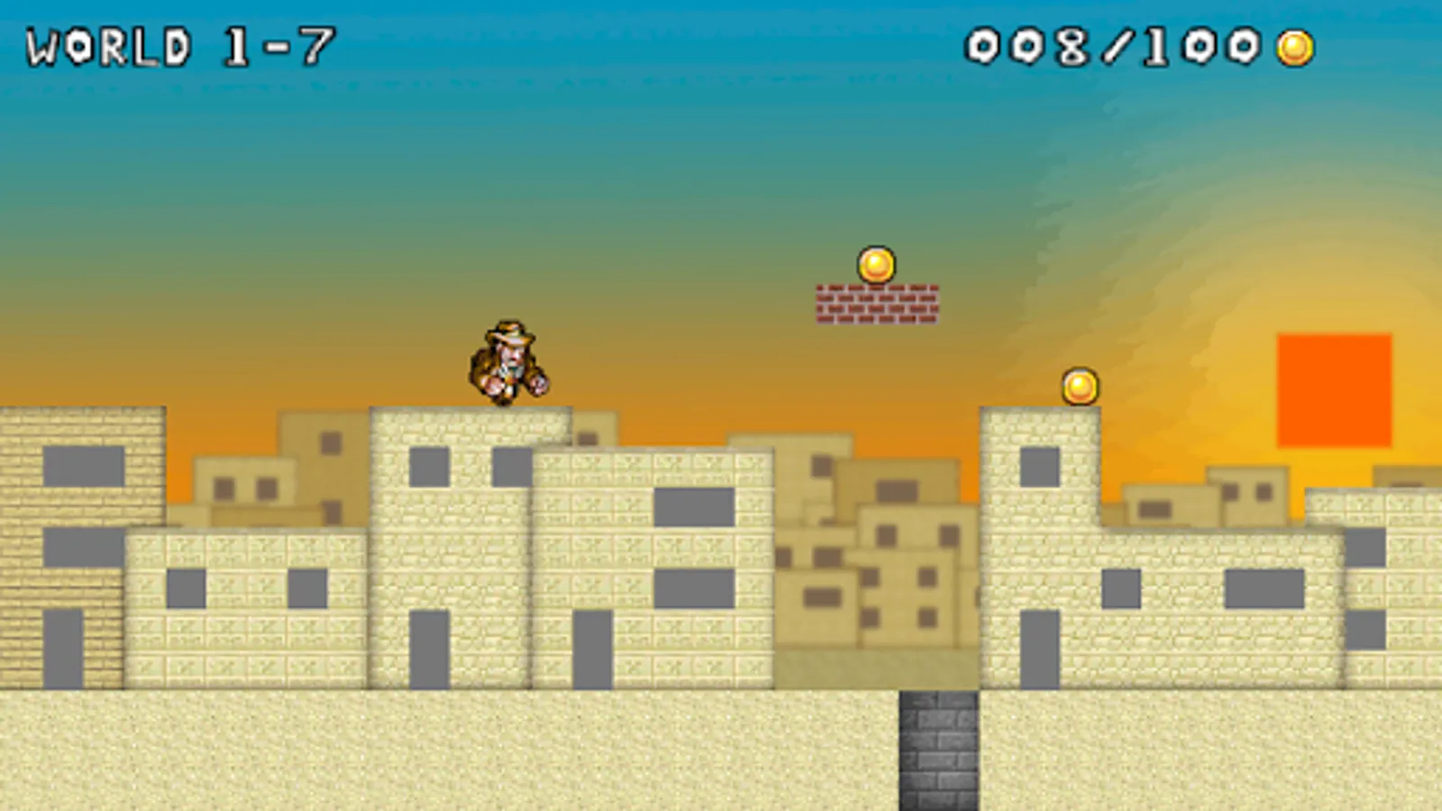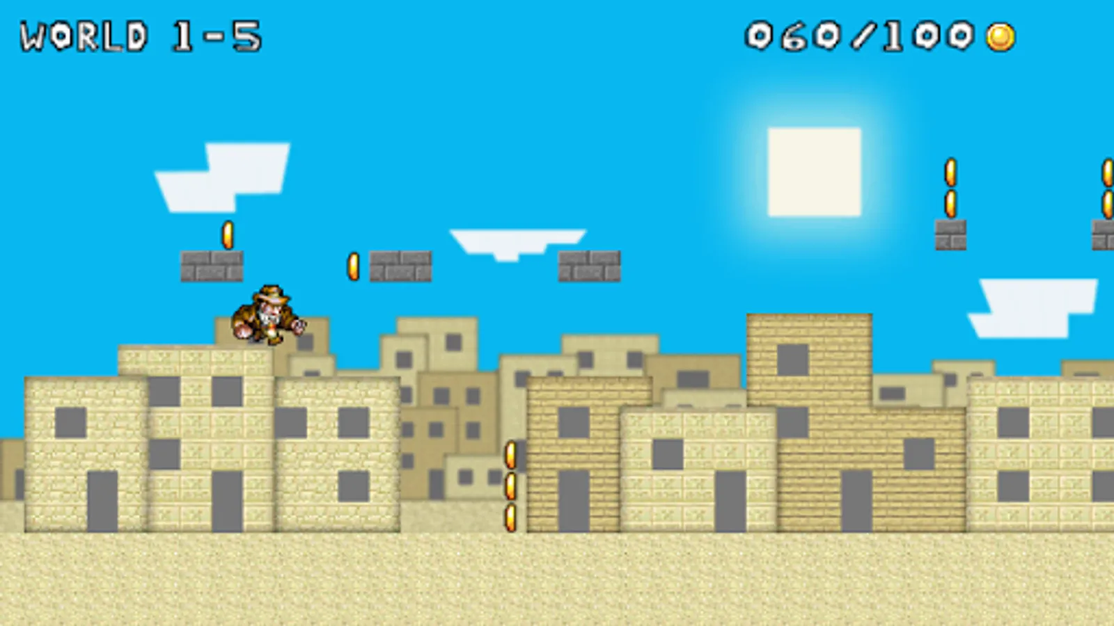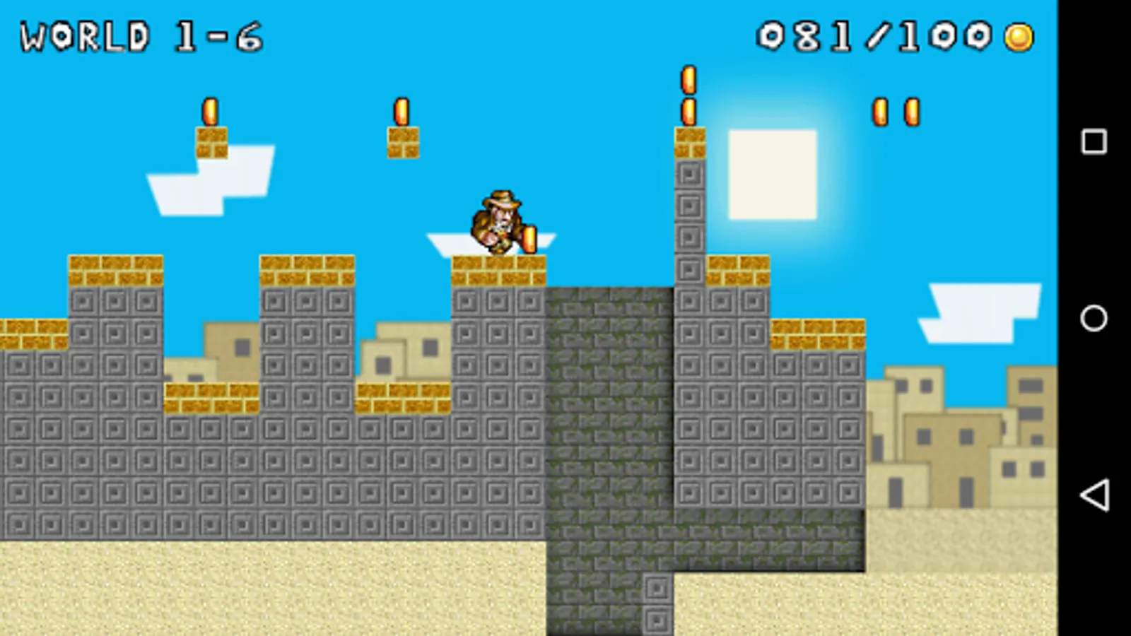 There are nine different levels. Each level has 100 coins to collect. Run and jump through the desert. Search for coins in Egypt. Old man Indy is on his first adventure. If you like this game please leave us a comment. We're looking forward to support this app. We plan to create new worlds and lots of level and not just in Egypt. So let us know if the game is worth extra work.