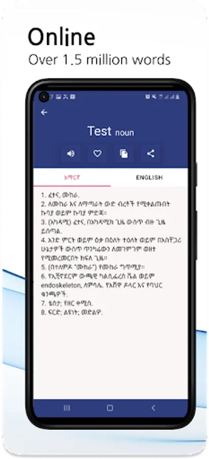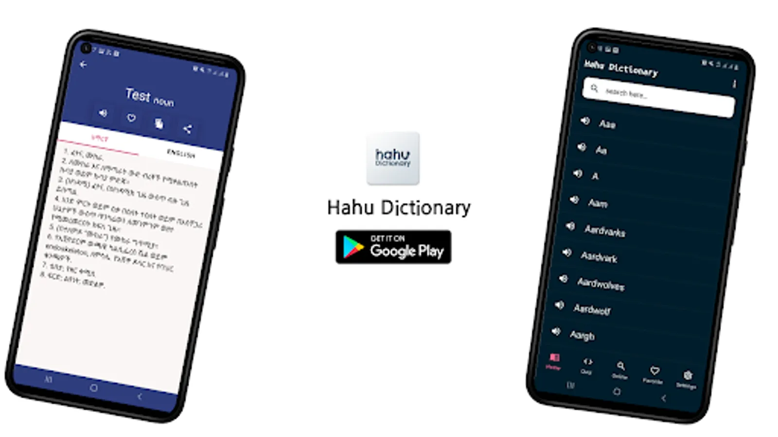 Amharic is an Ethiopian Semitic language, which is a subgrouping within the Semitic branch of the Afroasiatic languages. It is spoken as a first language by the Amharas, and also serves as a lingua franca for all other populations residing in major cities and towns of Ethiopia. Using Hahu dictionary you can translate English words to Amharic language (Engish to Ahmaric translate) and also English words to English not only that it contains over 220,000 words and it works without any internet...Maybe if the Words you want to know are not in these dictionaries you can easily use the internet to search on the space we have provided for you! (English To Amharic Dictionary)