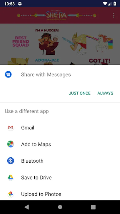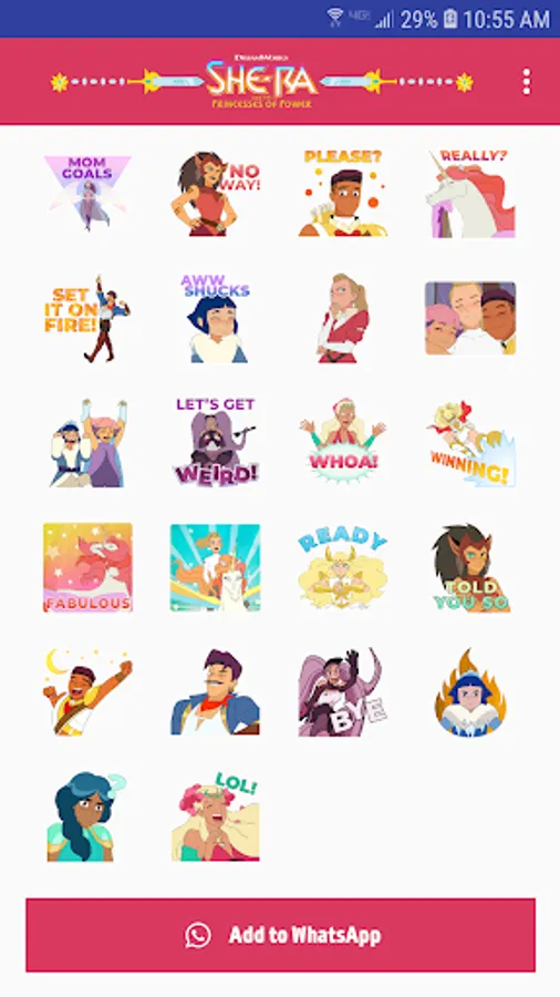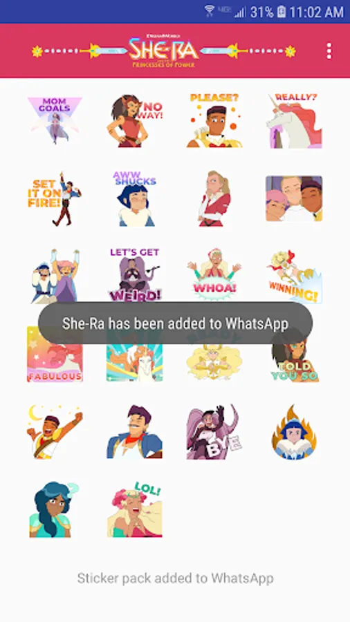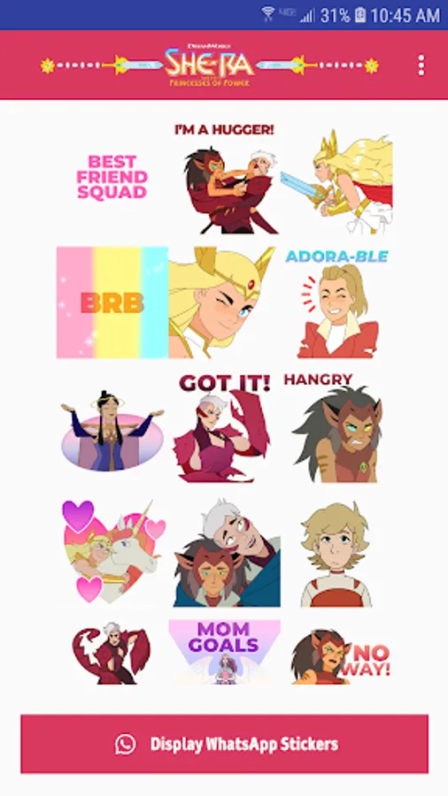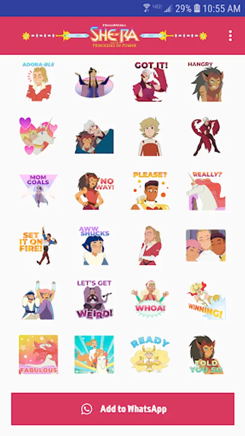 This official She-Ra sticker pack lets you send dozens of authentic images from the Netflix animated TV series DreamWorks She-Ra and the Princesses of Power. Forget emojis — send your friends cute, funny, inspirational stickers of She-Ra, Catra, Glimmer, Adora’s Magic Sword, Swift Wind and more. Also works in WhatsApp!