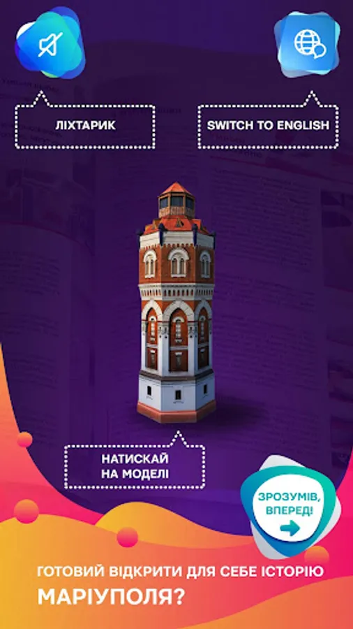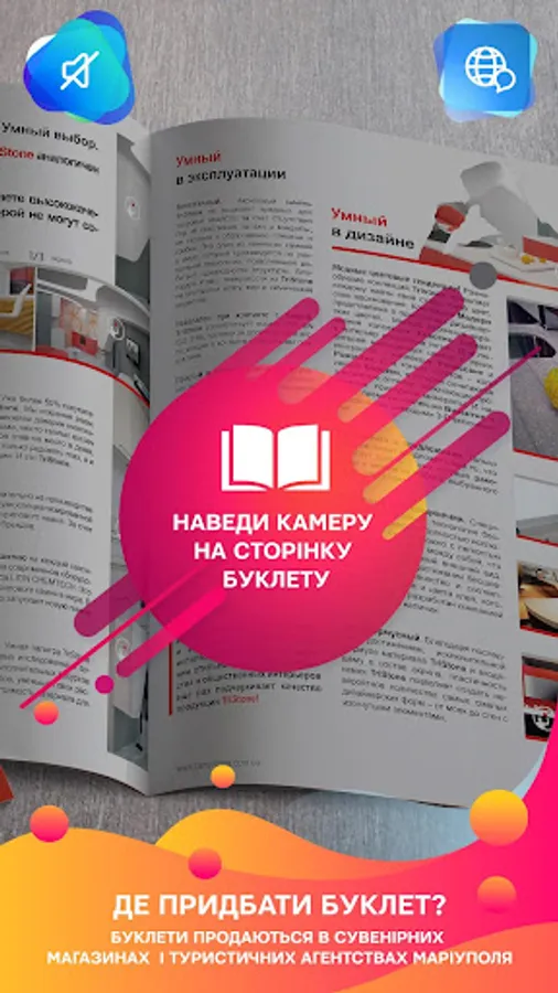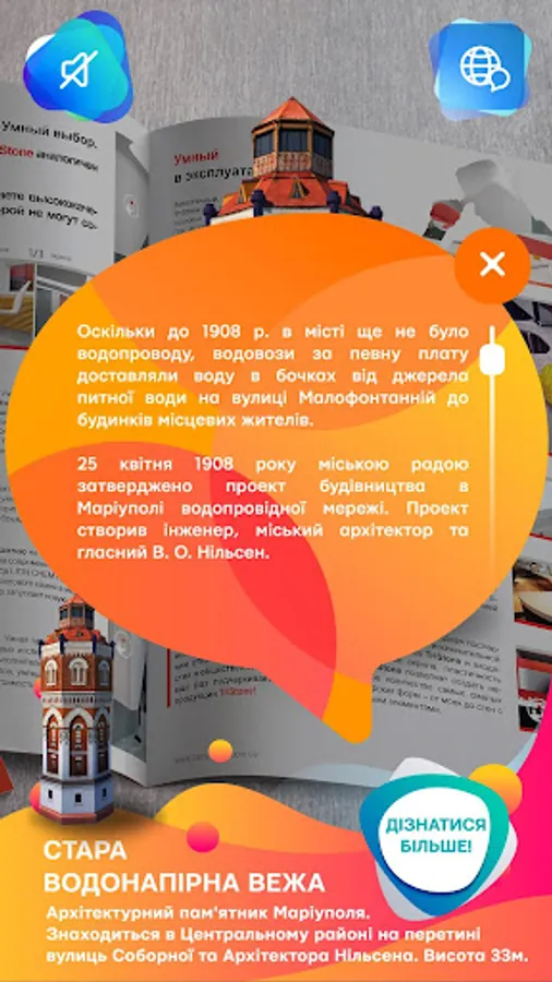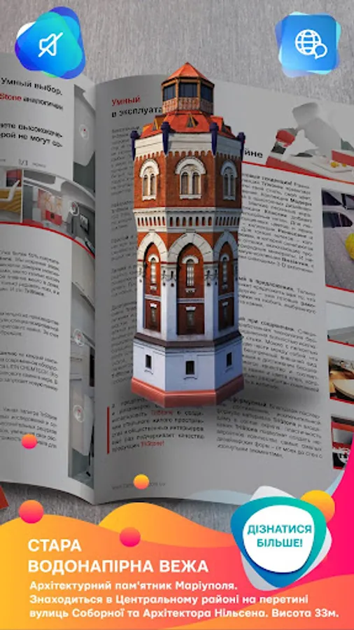 The appendix complements the tourist brochure - demonstrates three-dimensional models of the monuments of Mariupol in complemented reality on the pages of the tourist brochure.