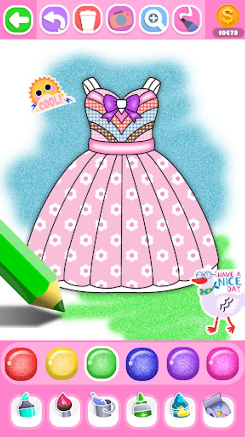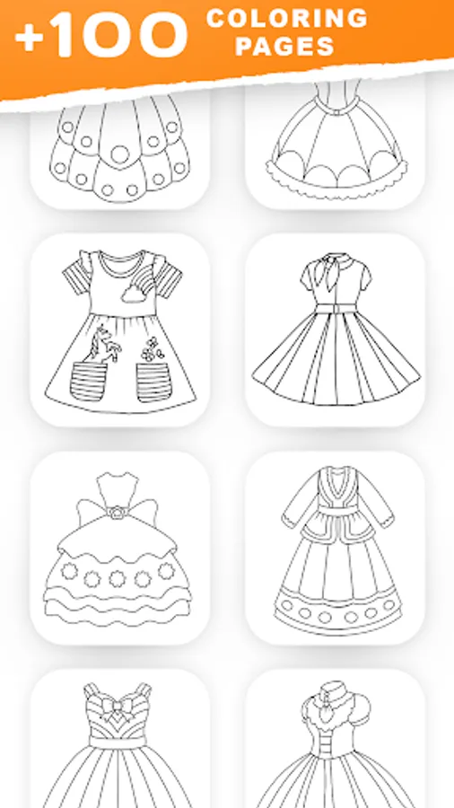 Paint and get your dress shine with the Glitter painting tool on Dresses Coloring Book - Drawing pages game for girls. Our painting game is the top free app to glitter color the most beautiful dresses, there are variety of dresses from which you can choose the one you want to glitter color and match the glitters to complete the most pretty picture of the cute dress.