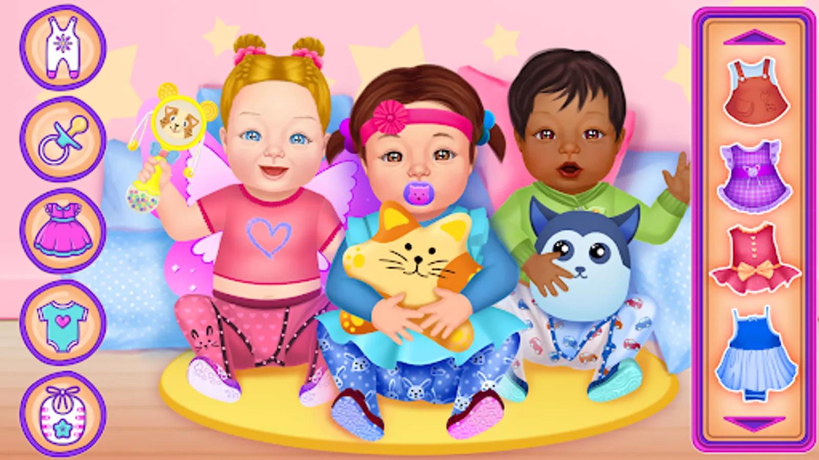 Baby care and dress up is an entertaining babysitter emulation in your phone. Learn to take care of baby like its mommy or nanny. Look after your baby girl or boy, select stylish outfits and play with your bundle of joy. All the best features of kids dress up games and fun babysitting games.
