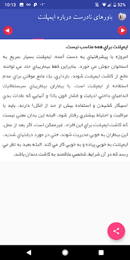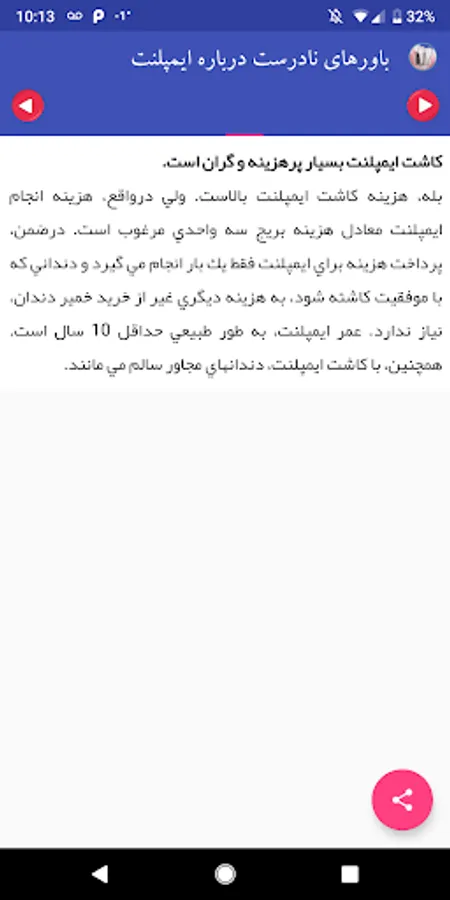Most people have a strange fear of dental implants. Because wrong beliefs have come to their instigation. For example, it's a lot of pain, it can cost a lot, or it may damage other teeth. Dr Hemmati, member of the International Association of Implantologists, ends this belief. Please install and read this app to learn about this.