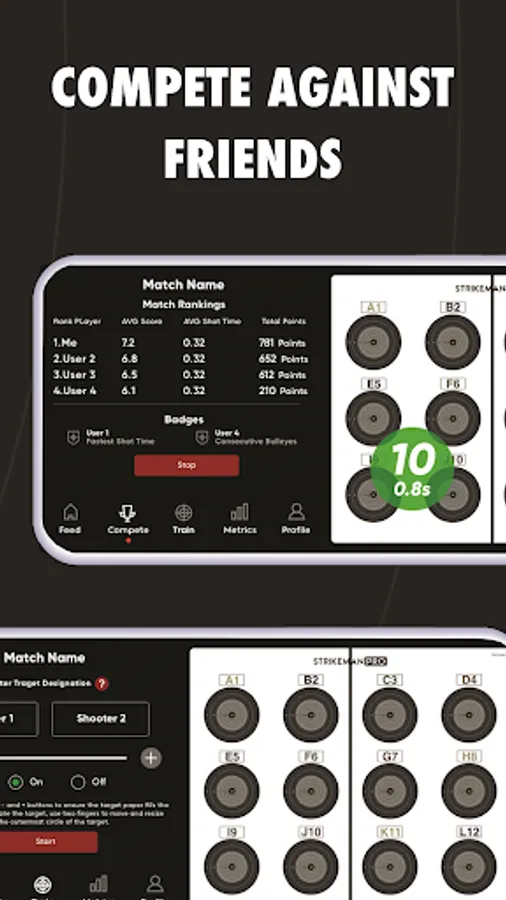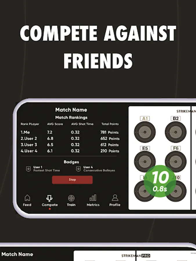 The Strikeman app allows users to practice their shooting skills without the need for real ammunition. Using our laser bullet, target and smart phone mount, the app records the target and records the users shot scores based on where the laser hit the target.
