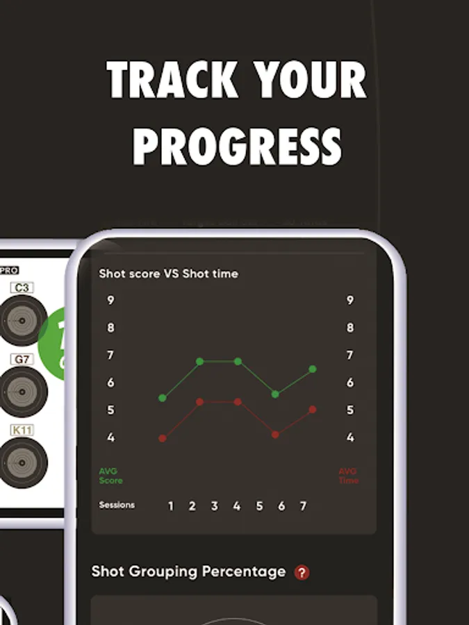 The history section provides screenshots, shooting metrics, and graphs for the user to track their progress. This includes average score, average range, total shots and total sessions. The information is presented on a histogram and a pie chart. This information is saved in an archive.