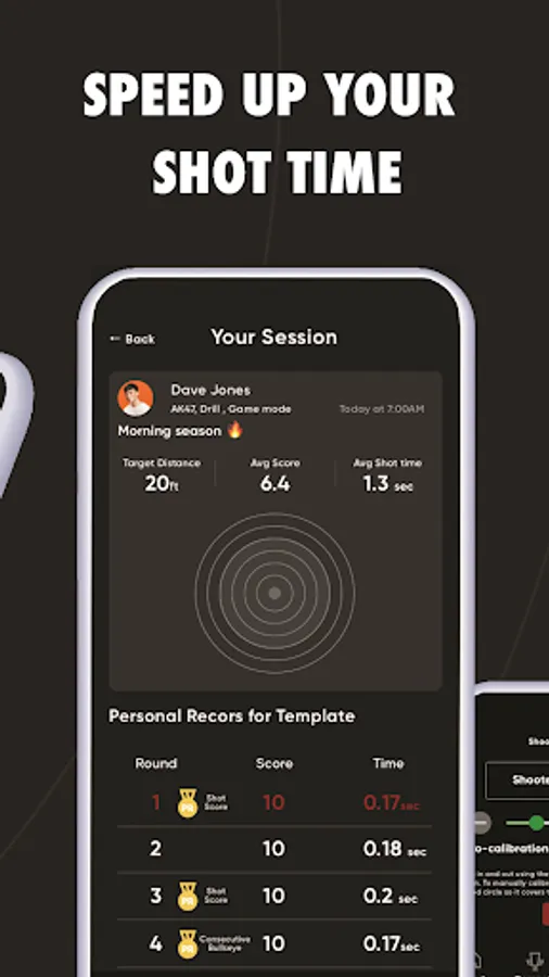 The training section is the initial area of the app where the user can practice their shooting skills. Upon beginning a session, a warning screen is shown to ensure that proper firearm safety is taking place before beginning a session. Once the user agrees, the target appears on the screen. The user calibrates the screen to the target by using two fingers to cover the circumference of the target. Then, the distance from the target is selected and they can begin shooting. Each shot from the firearm triggers a laser, which emits a laser strike on the target, and the app records the score. Shooting metrics appear on the screen to show the user how they are doing during the session. This is accompanied by audio. Once the session is complete, all shots will be shown on the target and saved into an archive.