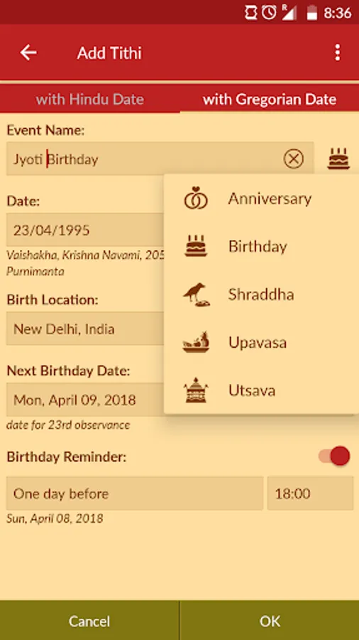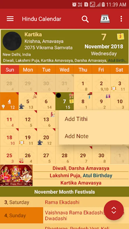 Add Tithi - User defined Tithi can be added to Panchang with recursive reminder as per Hindu date or Gregorian date.