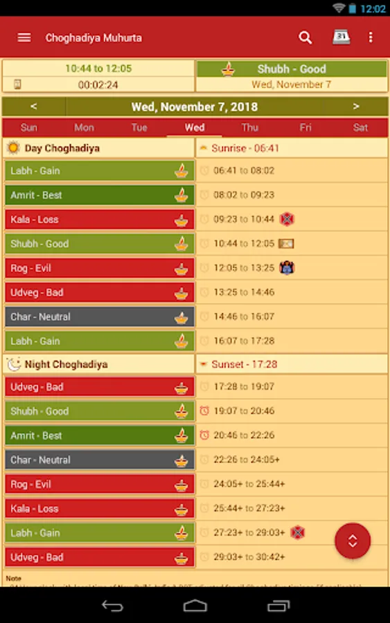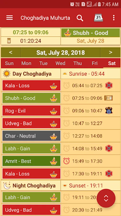 Muhurta Table - Drik Panchang comes with day and night Choghadiya, Shubh Horai and Udaya Lagna. Each running Muhurta is shown with count down timer.