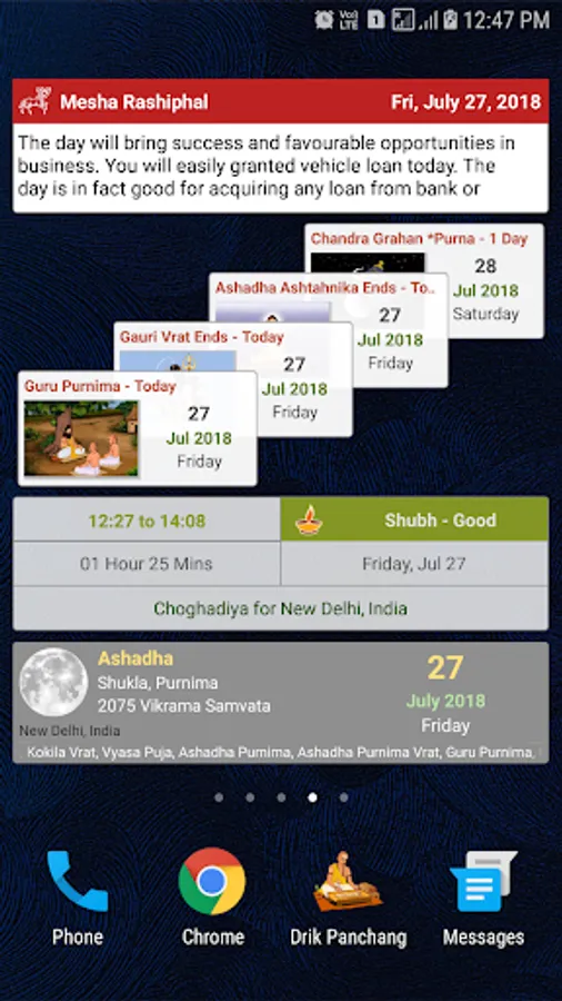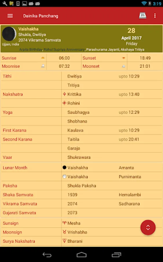 Drik Panchang is one of the most reputed Panchangam available on Internet. It has been made available for Android devices with similar features and precision as that of www.DrikPanchang.com This native Panchang, which doesn't need Internet connectivity to use, comes with following features