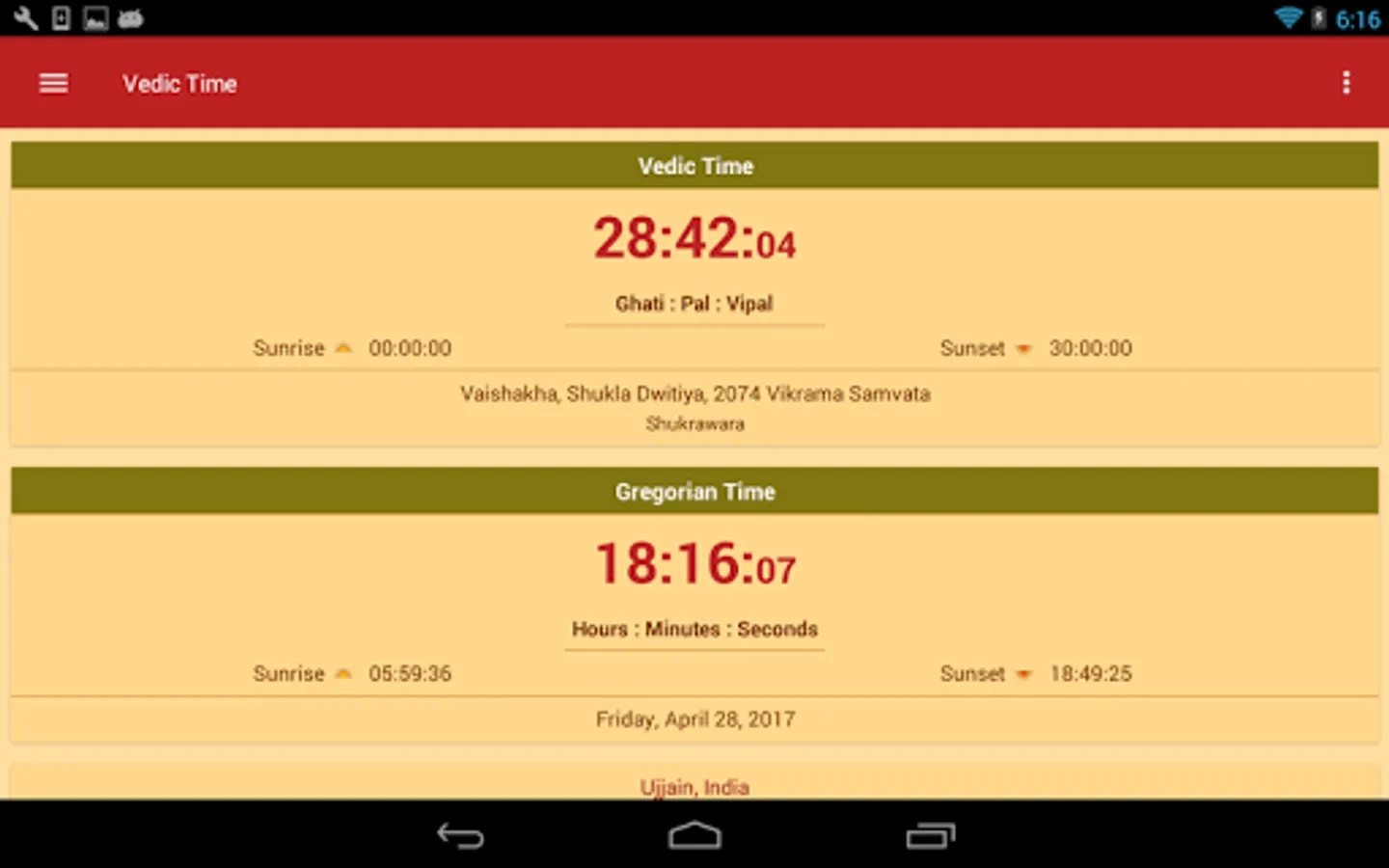 Vedic Timer - Vedic time which is also known as Ishtakal is provided to track time as per Vedic Era of Hinduism. In Vedic time, each day (from sunrise to sunrise) is divided into Ghati, Pala and Vipala similar to Hour, Mins and Secs. In Vedic time keeping, 60 Ghati makes a day, 60 Pala makes a Ghati and 60 Vipala makes a Pala. At Sunrise timers shows 00:00:00 and at Sunset it shows 30:00:00.