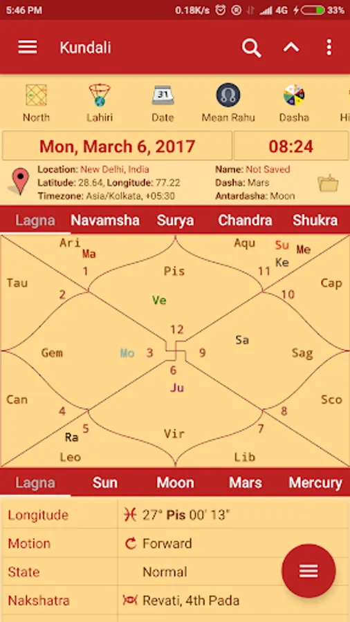 Kundali Support - Drik Panchang comes with Kundali support and it can generate Lagna, Navamsha, Surya, Chandra and Shukra Kundali for any date, time and location. For Lagna Kundali it shows detailed planetary position for Sun, Moon, Mars, Mercury, Jupiter, Venus, Saturn, Rahu, Ketu, True Rahu, True Ketu, Uranus, Neptune and Pluto.