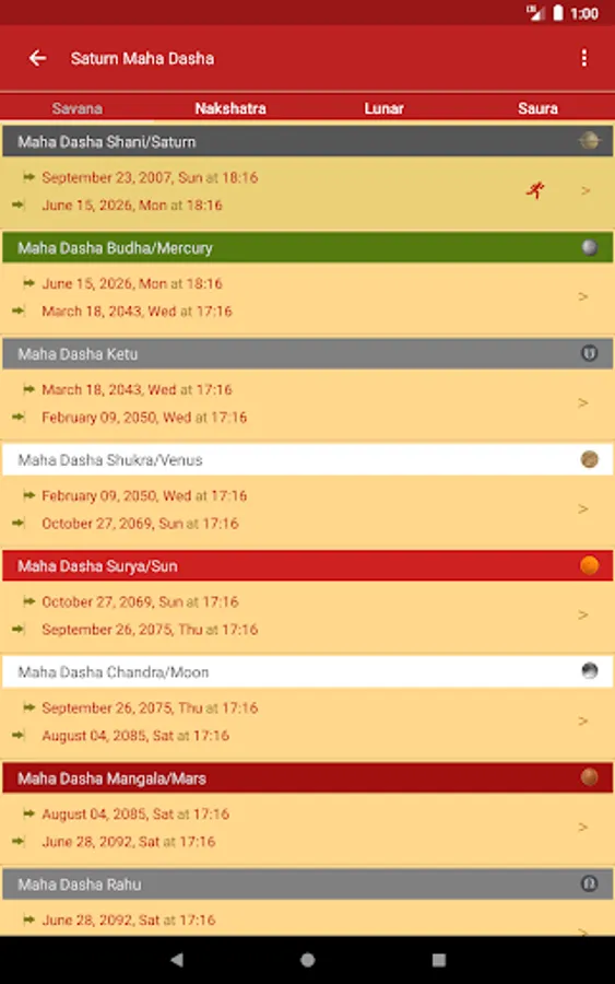 The Kundali can be drawn either in North Indian or South Indian chart format. Kundali can be Saved, Edited, Deleted or Opened with the help of Kundali editor. Each Kundali is tagged with running Dasha and Antardasha. Kundali comes with an option to explore detailed Dasha and Antardasha for next 120 years.