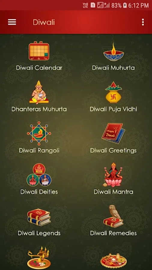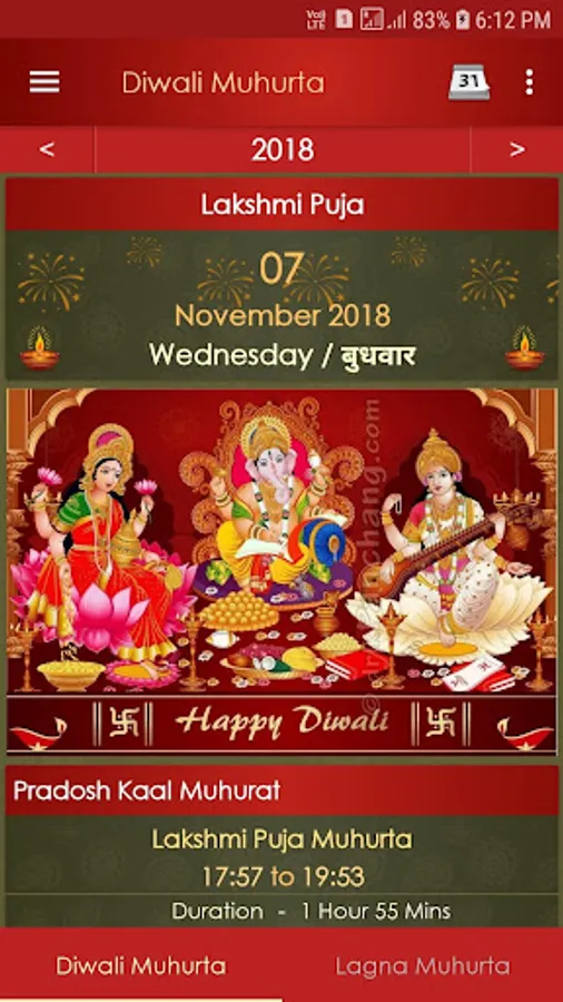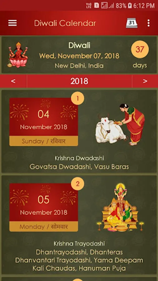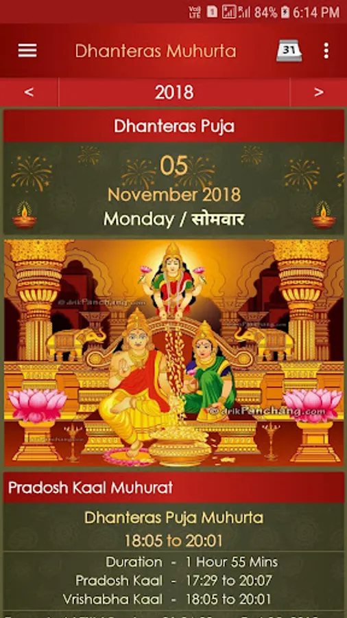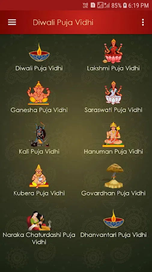 • Diwali Puja Vidhi - Deepavali App lists different Puja Vidhi(s) e.g. Diwali Puja, Lakshmi Puja, Ganesha Puja, Saraswati Puja and Kuber Puja during Diwali festival.