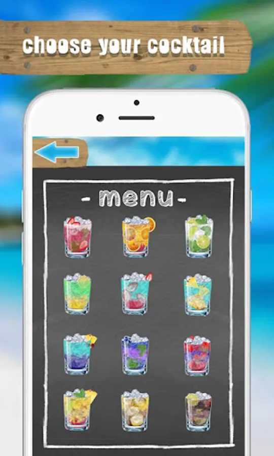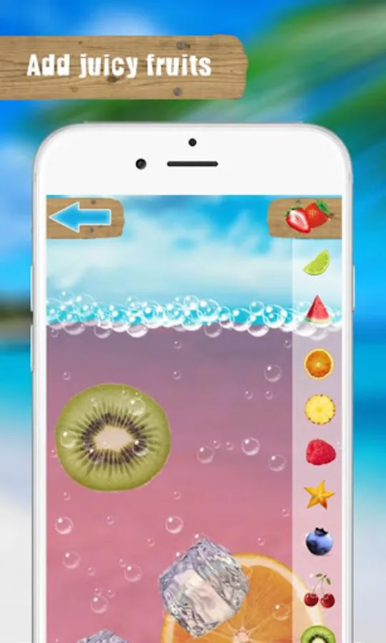 Add ice, strawberries, grapes, mango, lemon, orange, cherry to your drink in order to make a cocktail and drink from your phone.